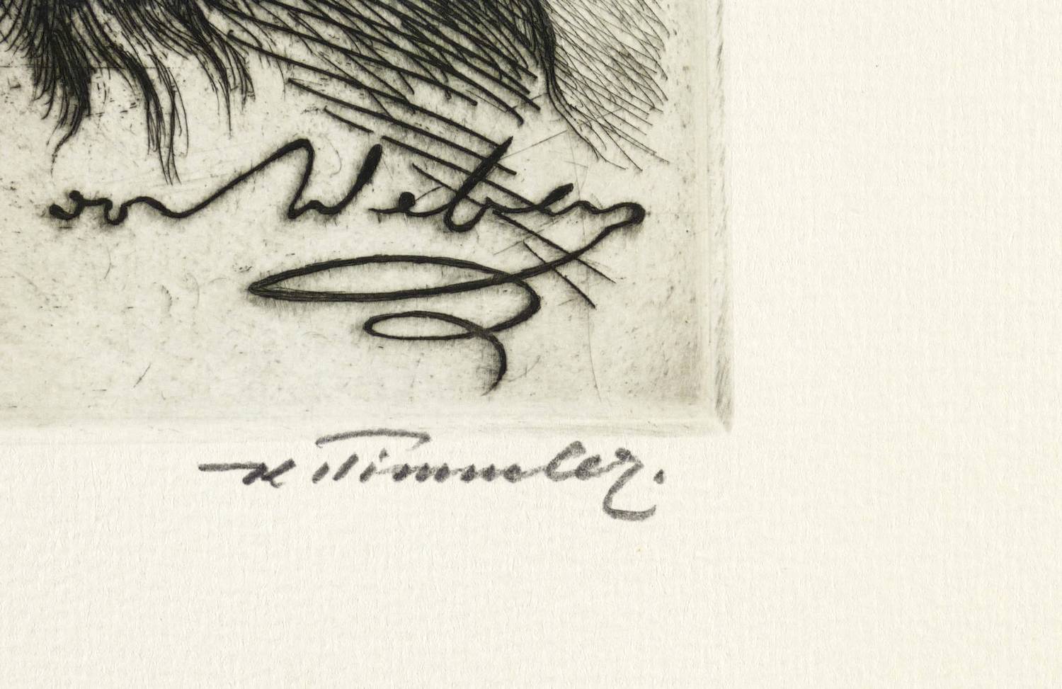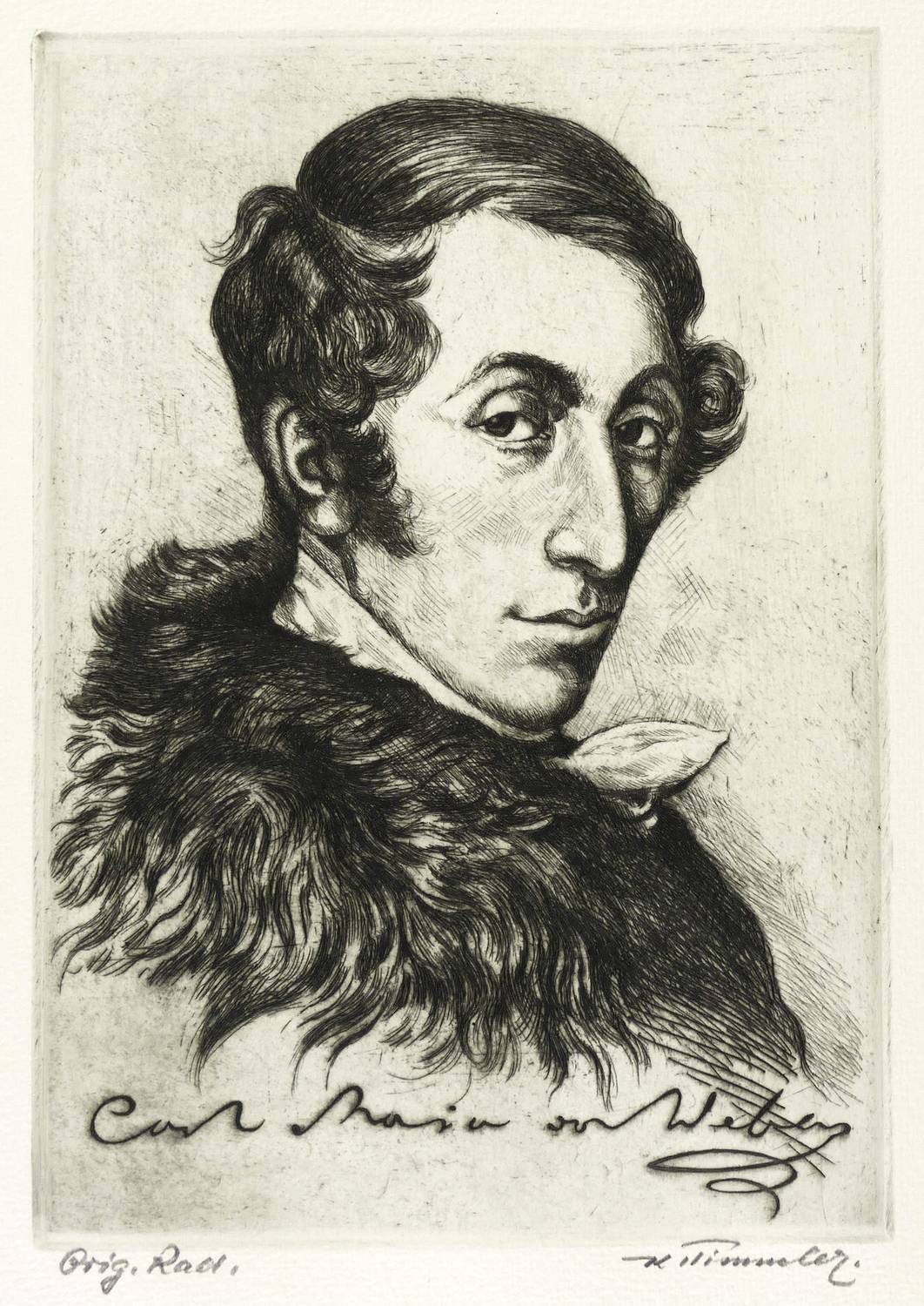 Rechts unten in Bleistift signiert: ″K. Timmler″. Links bezeichnet: ″Orig. Rad.″ In der Platte unten mit imitiertem Namenszug betitelt: ″Carl Maria von Weber″. – Breitrandiges Exemplar. Ohne Mängel. Hervorragender Zustand.