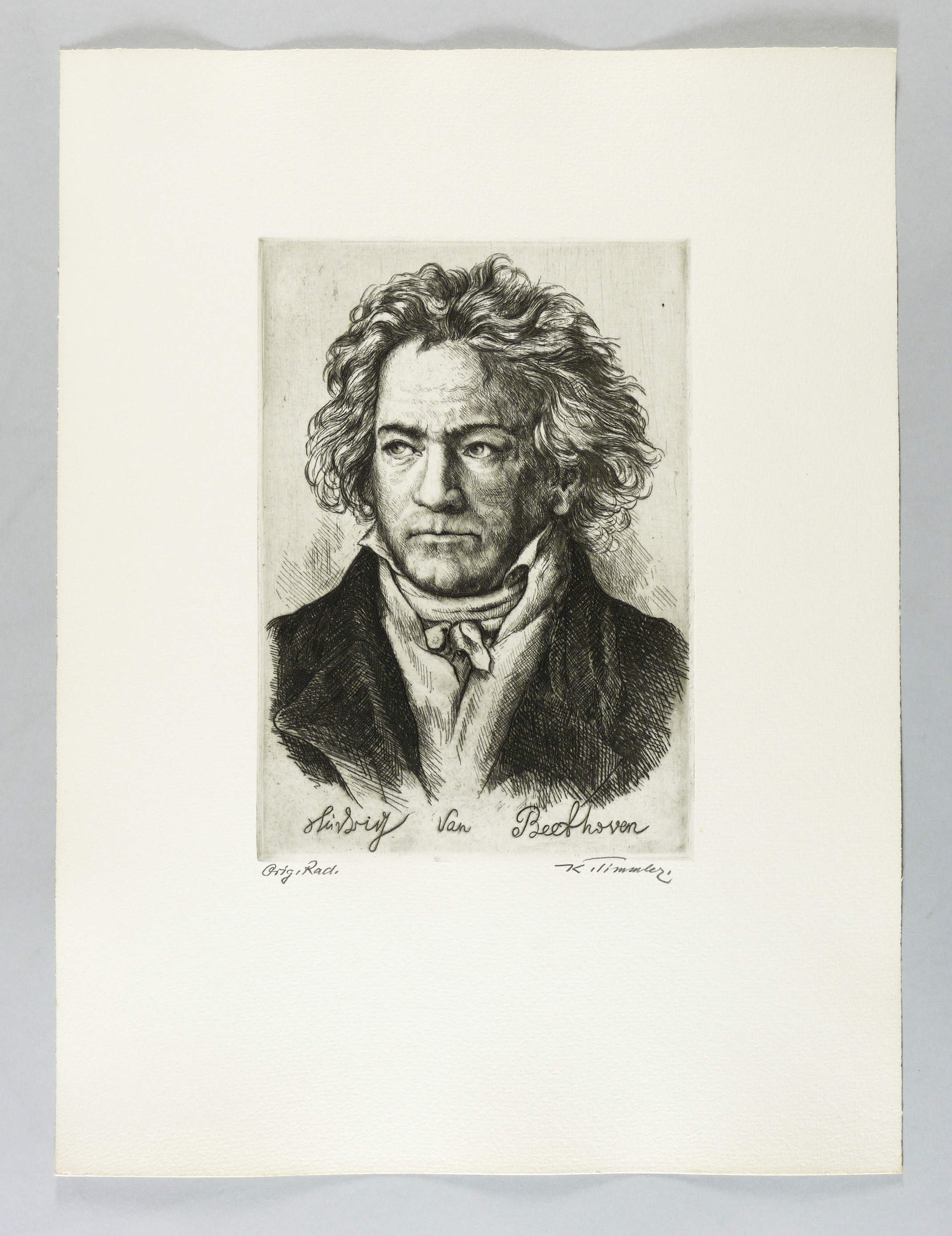Rechts unten in Bleistift signiert: ″K. Timmler″. Links bezeichnet: ″Orig. Rad.″ In der Platte unten mit imitiertem Namenszug betitelt: ″Ludwig Van Beethoven″. – Breitrandiges Exemplar. Ohne Mängel. Sehr guter Zustand.