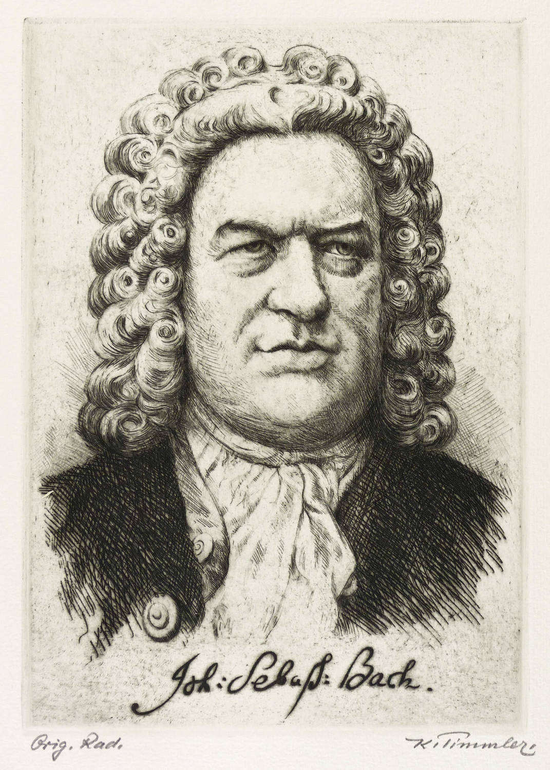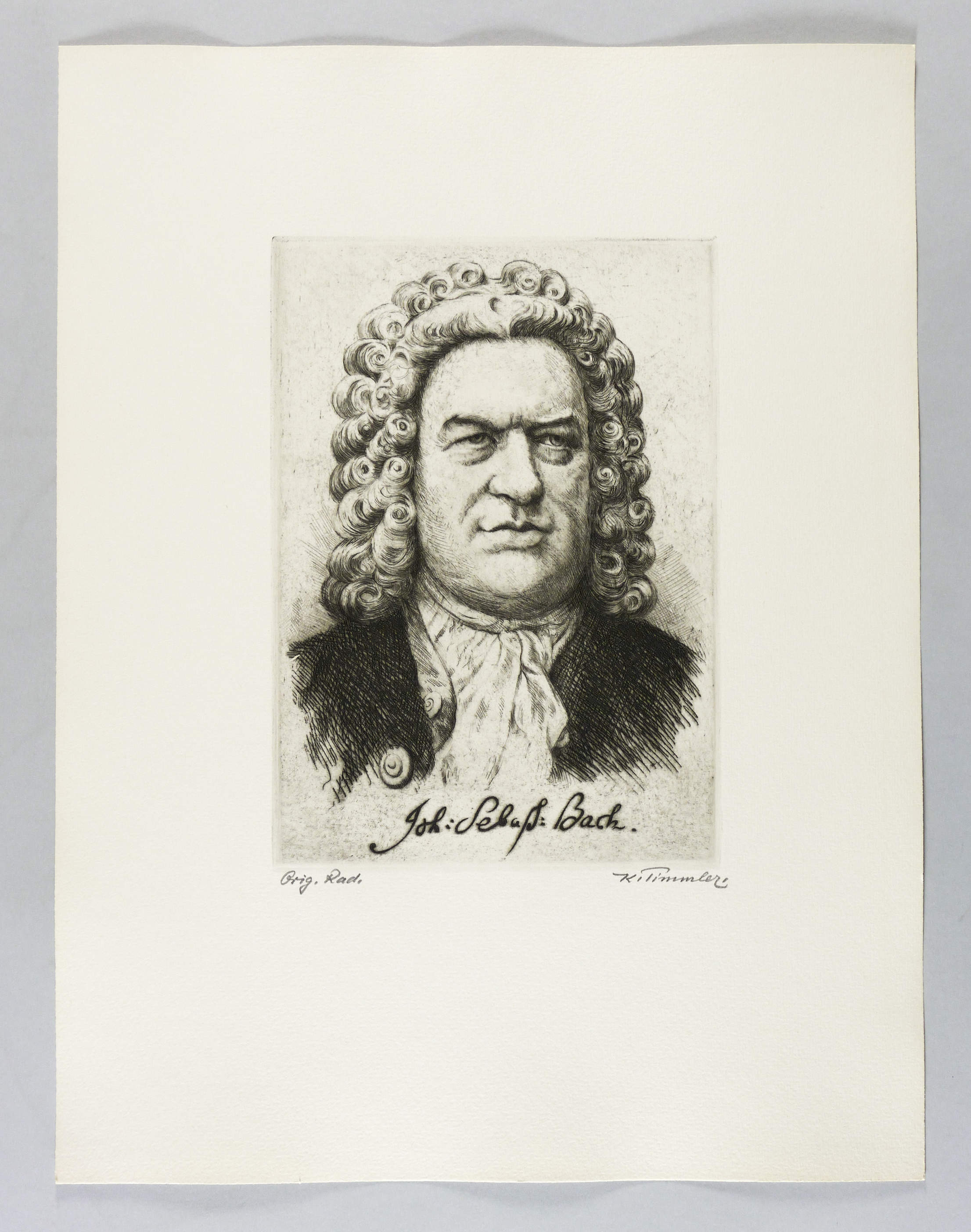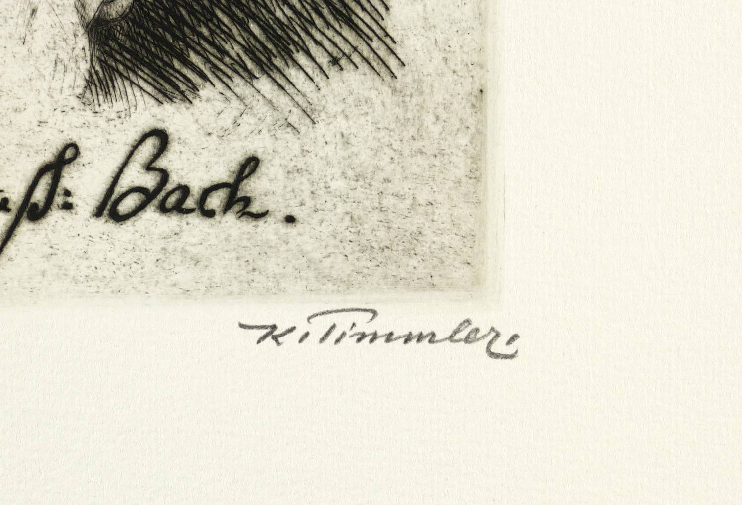 Rechts unten in Bleistift signiert: ″K. Timmler″. Links bezeichnet: ″Orig. Rad.″ In der Platte unten mit imitiertem Namenszug betitelt: ″Joh: Sebaß: Bach.″ – Breitrandiges Exemplar. Ohne Mängel. Sehr guter Zustand.