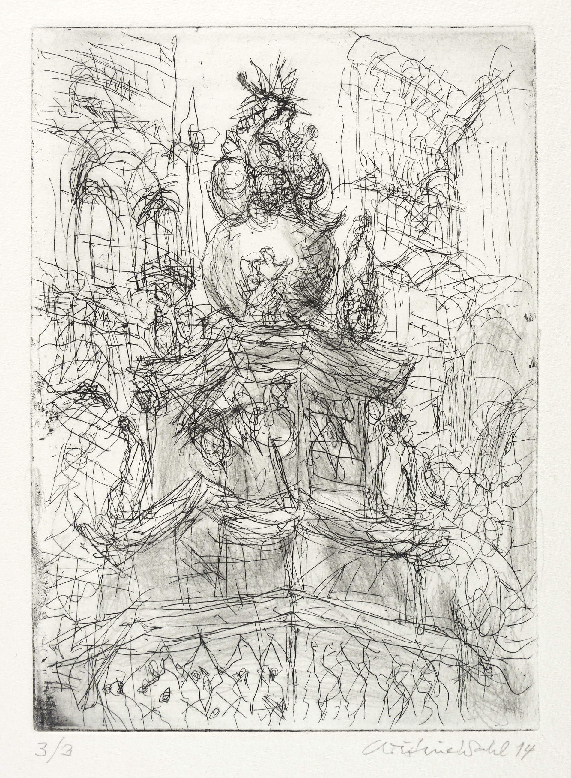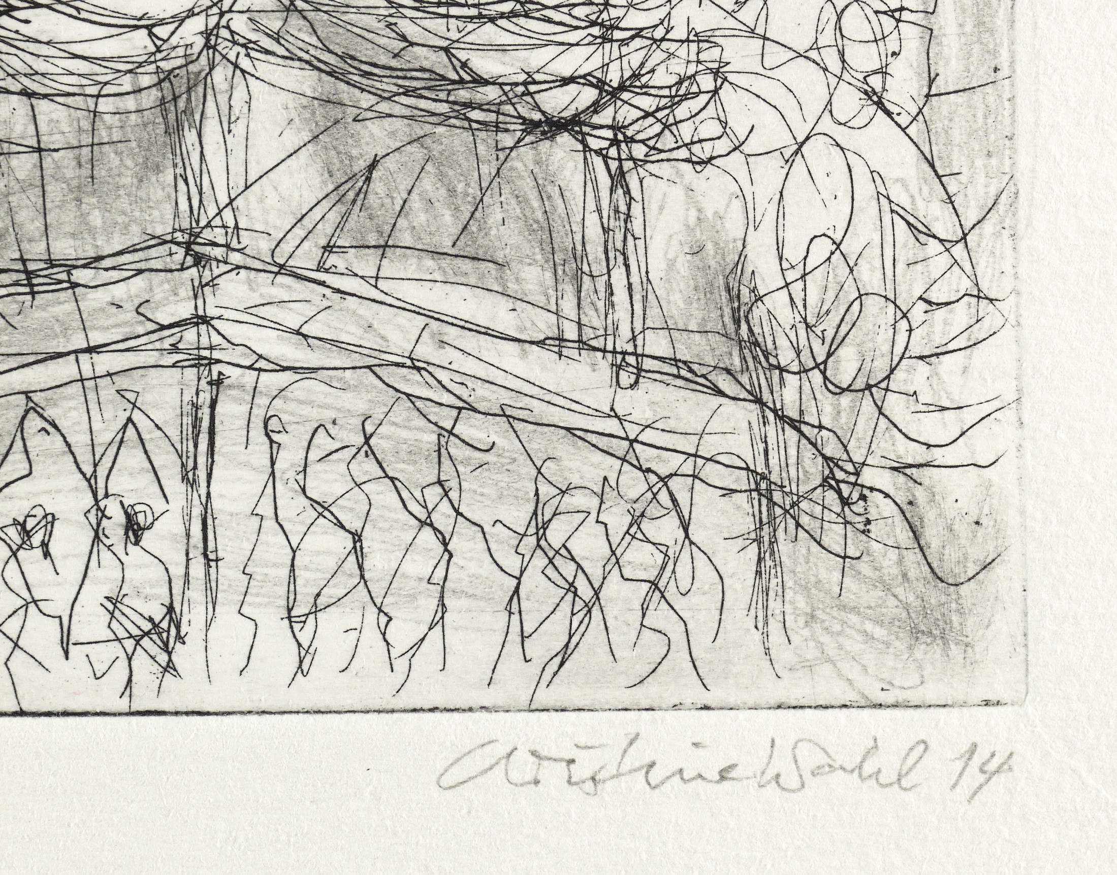 2014. Radierung / Strichätzung, in Schwarz, in Bleistift schattiert, auf hellem Velinkarton. – Originale Künstlergrafik, von Christine Wahl. – Auflage Exemplar Nr. 3/3. – 19,5 x 14,0 cm (Darstellung / Platte), 28 x 21 cm (Blatt).