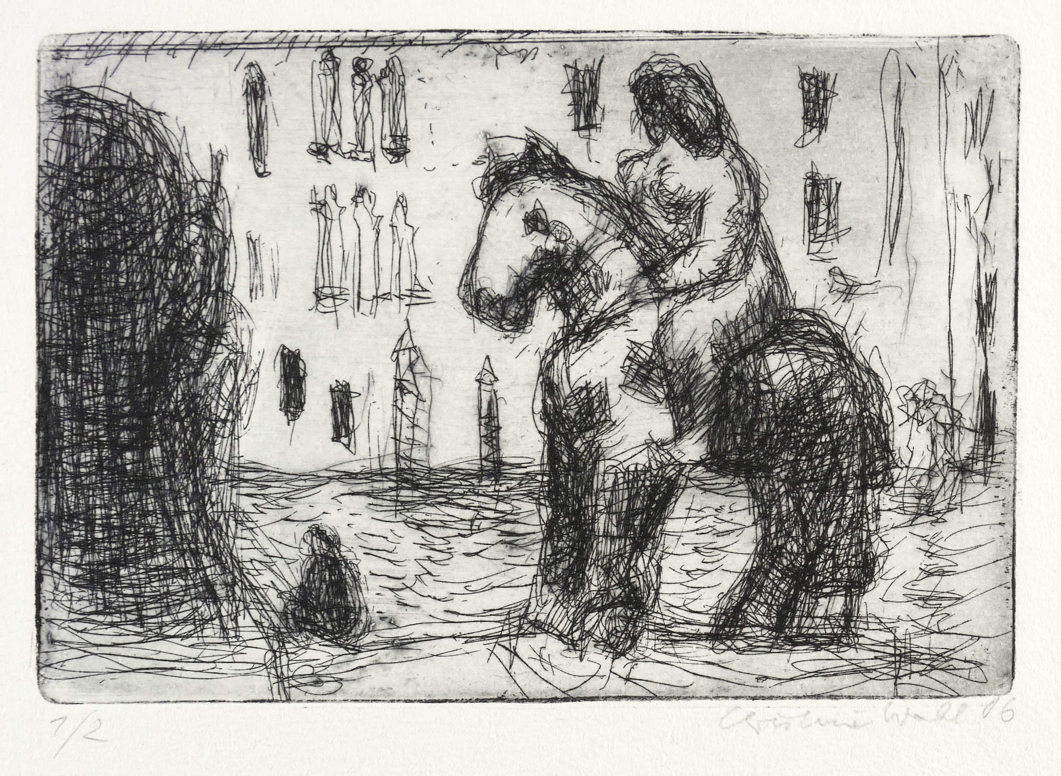 2006. Radierung / Strichätzung, in Schwarz, mit Plattenton, auf hellem Velinkarton. – Originale Künstlergrafik, von Christine Wahl. – Auflage Exemplar Nr. 1/2. – 11,7 x 16,9 cm (Darstellung / Platte), 26 x 35 cm (Blatt).