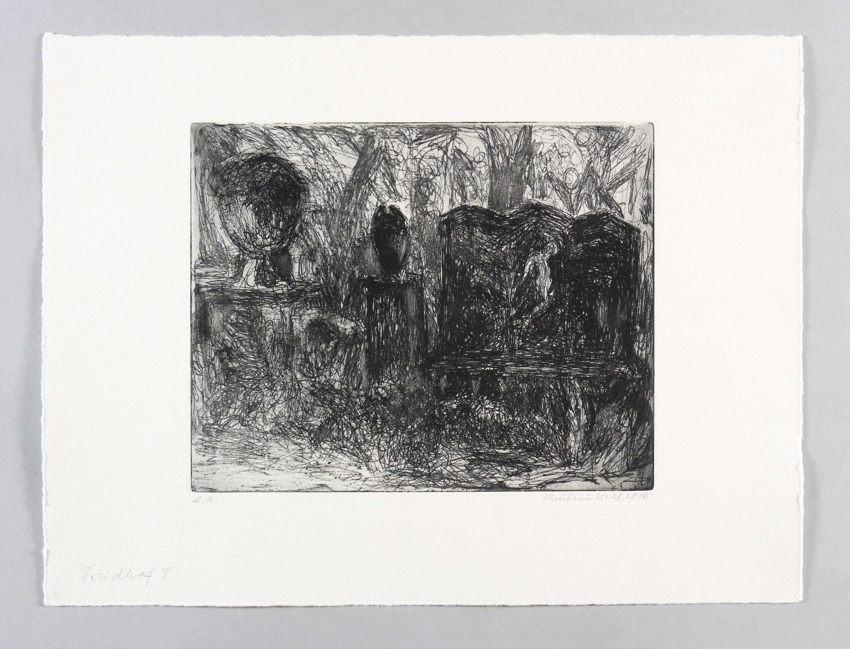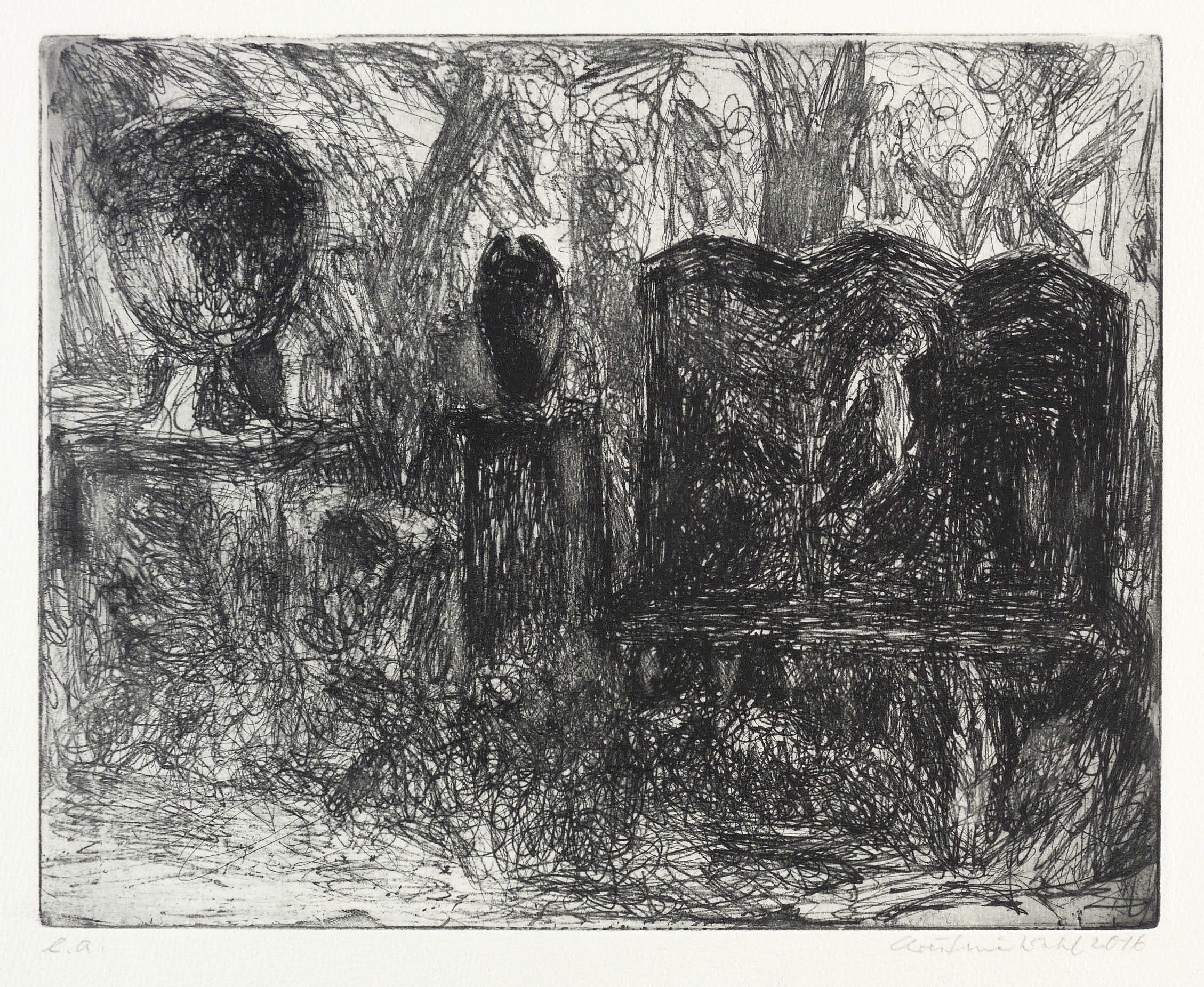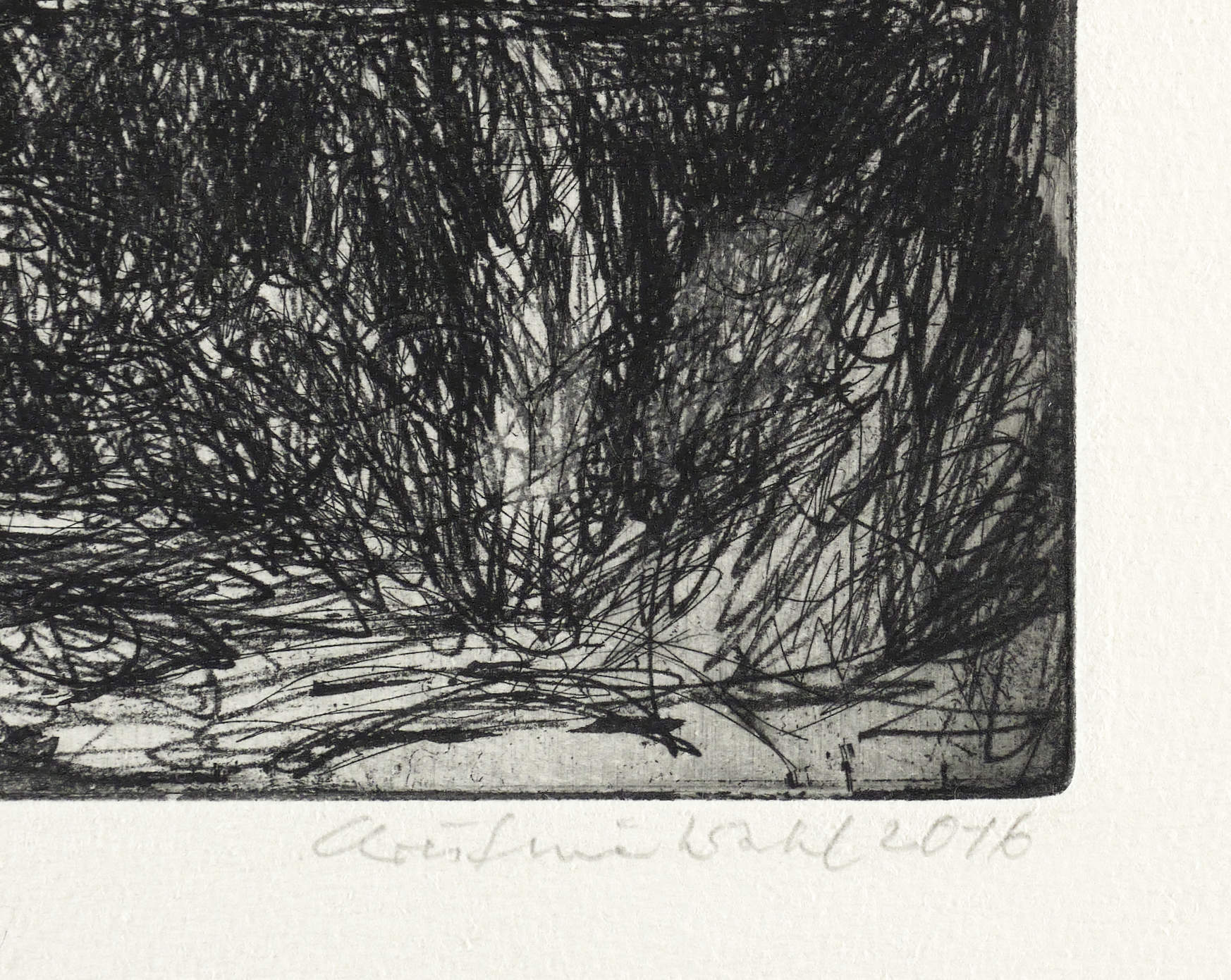 2016. Radierung / Vernis mou & Strichätzung, in Schwarz, mit Plattenton, auf hellgelbem Hahnemühle-Bütten. – Originale Künstlergrafik, von Christine Wahl. – Künstlerexemplar (e.a.). – 19,8 x 24,7 cm (Darstellung / Platte), 31 x 41 cm (Blatt).