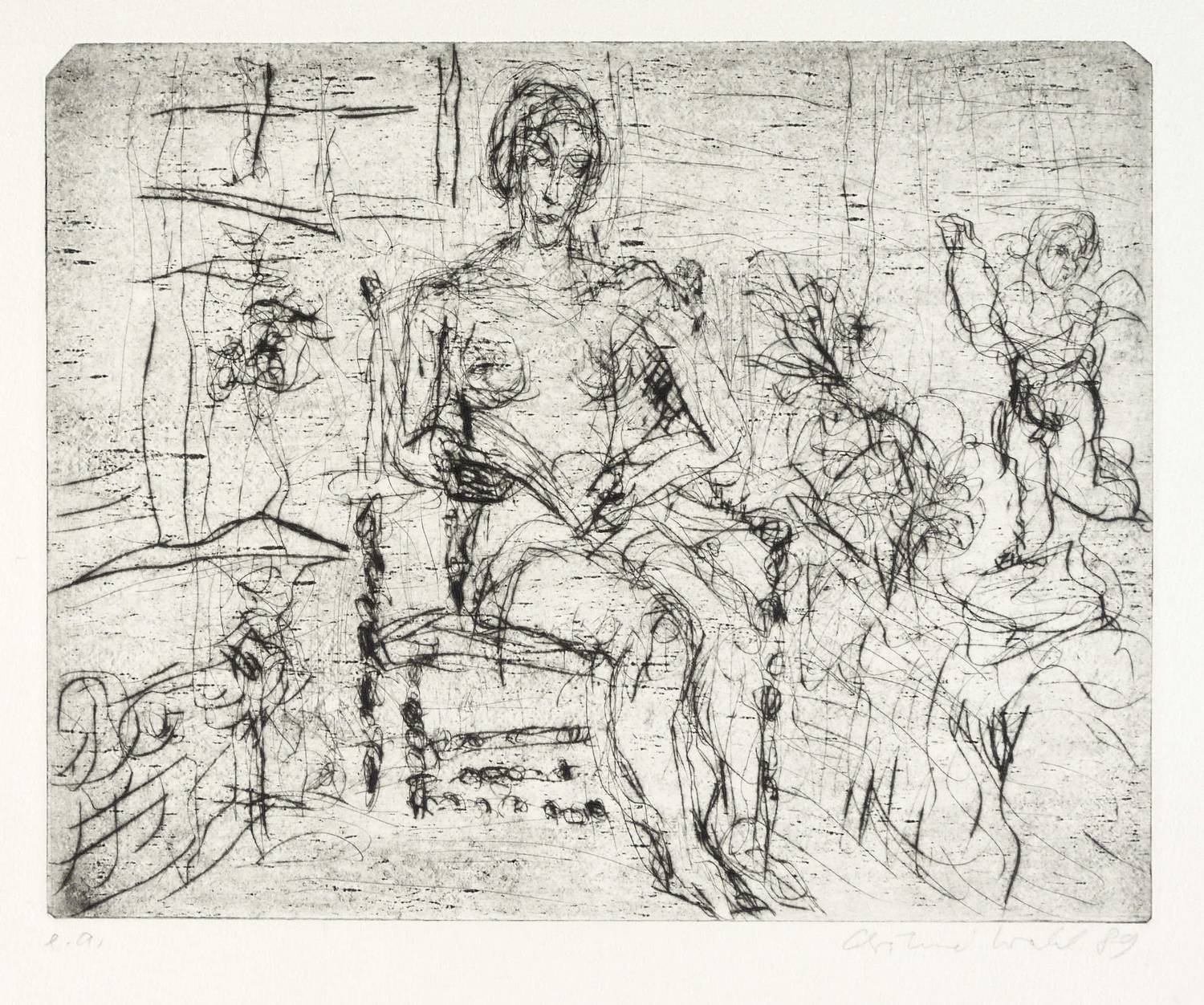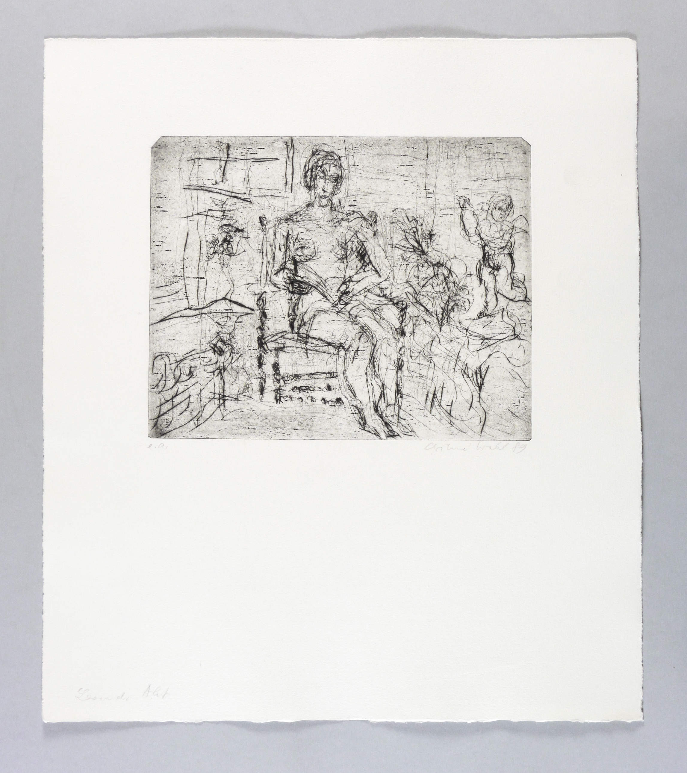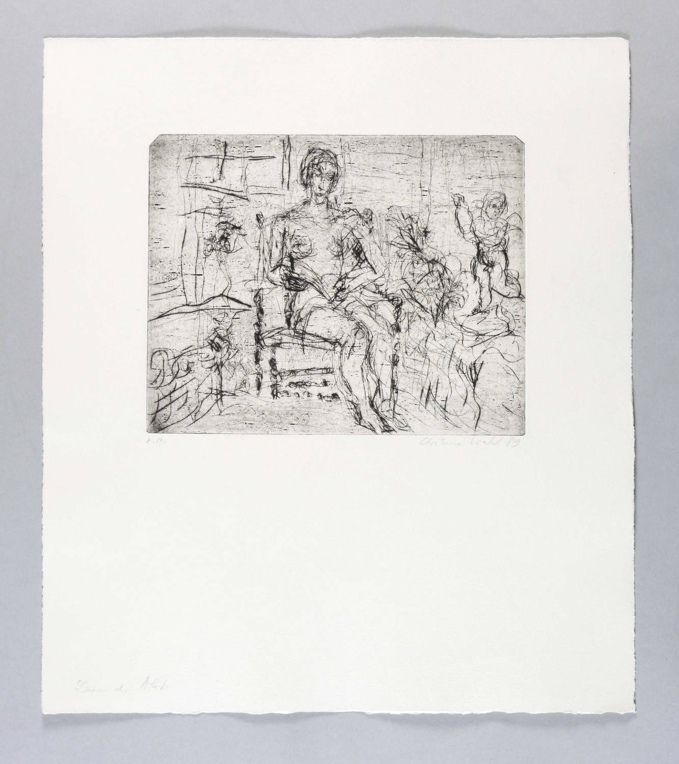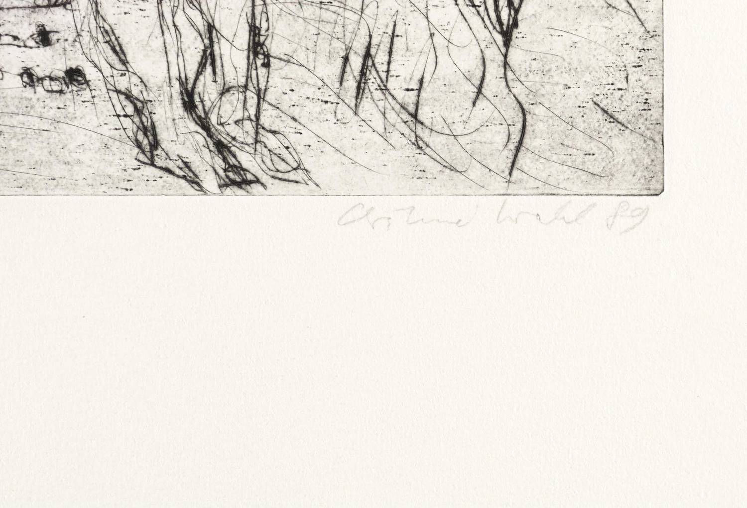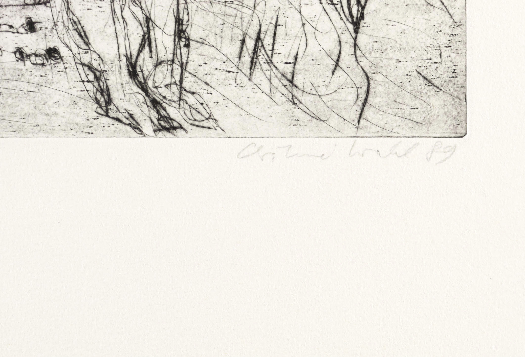 1989. Radierung / Kaltnadel, in Schwarz, mit Plattenton, auf hellgelbem Velin. – Originale Künstlergrafik, von Christine Wahl. – Künstlerexemplar (e.a.). – 20,1 x 25,1 cm (Darstellung / Platte), 45 x 39 cm (Blatt).