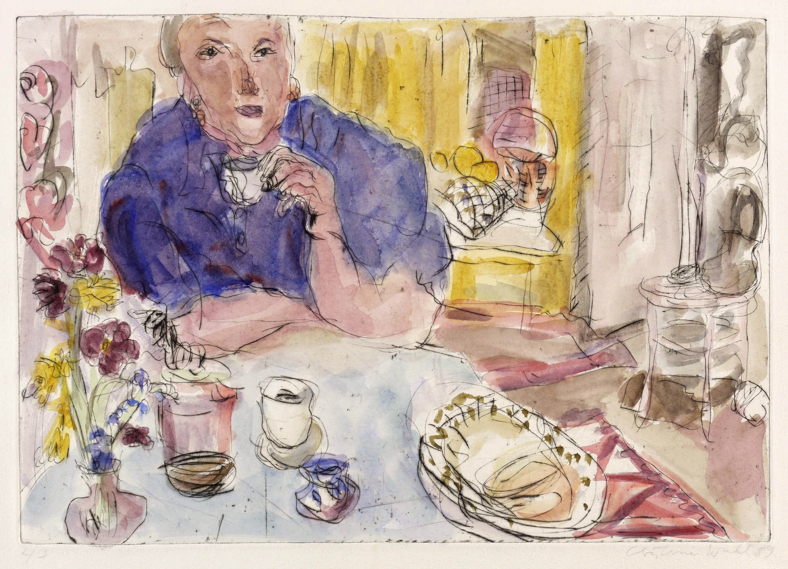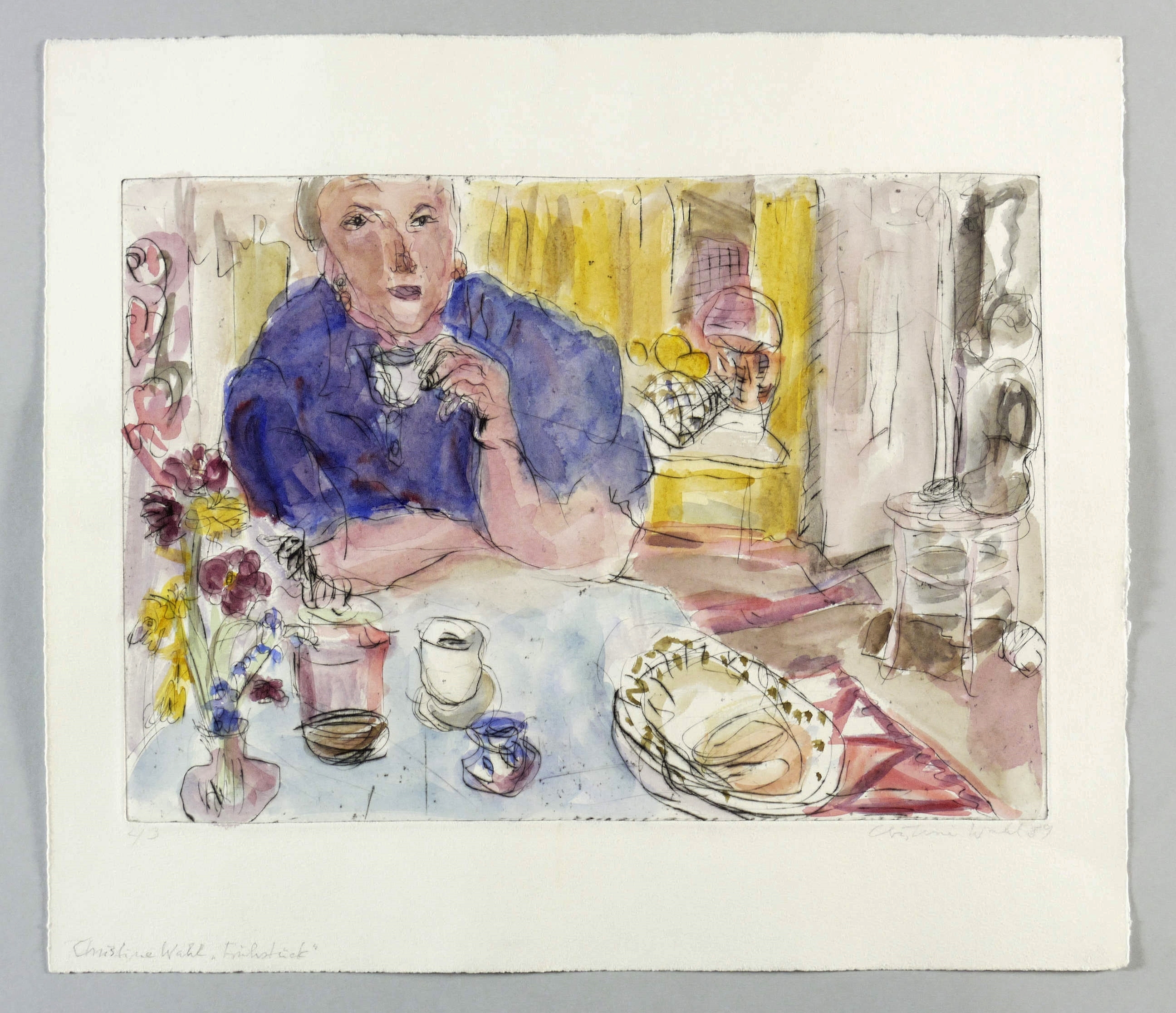 1989. Radierung / Kaltnadel, in Schwarz, aquarelliert, auf hellchamois Büttenpapier. – Originale Künstlergrafik, von Christine Wahl. – Auflage Exemplar Nr. 2/3. – 27,0 x 38,2 cm (Darstellung / Platte), 40 x 45 cm (Blatt).