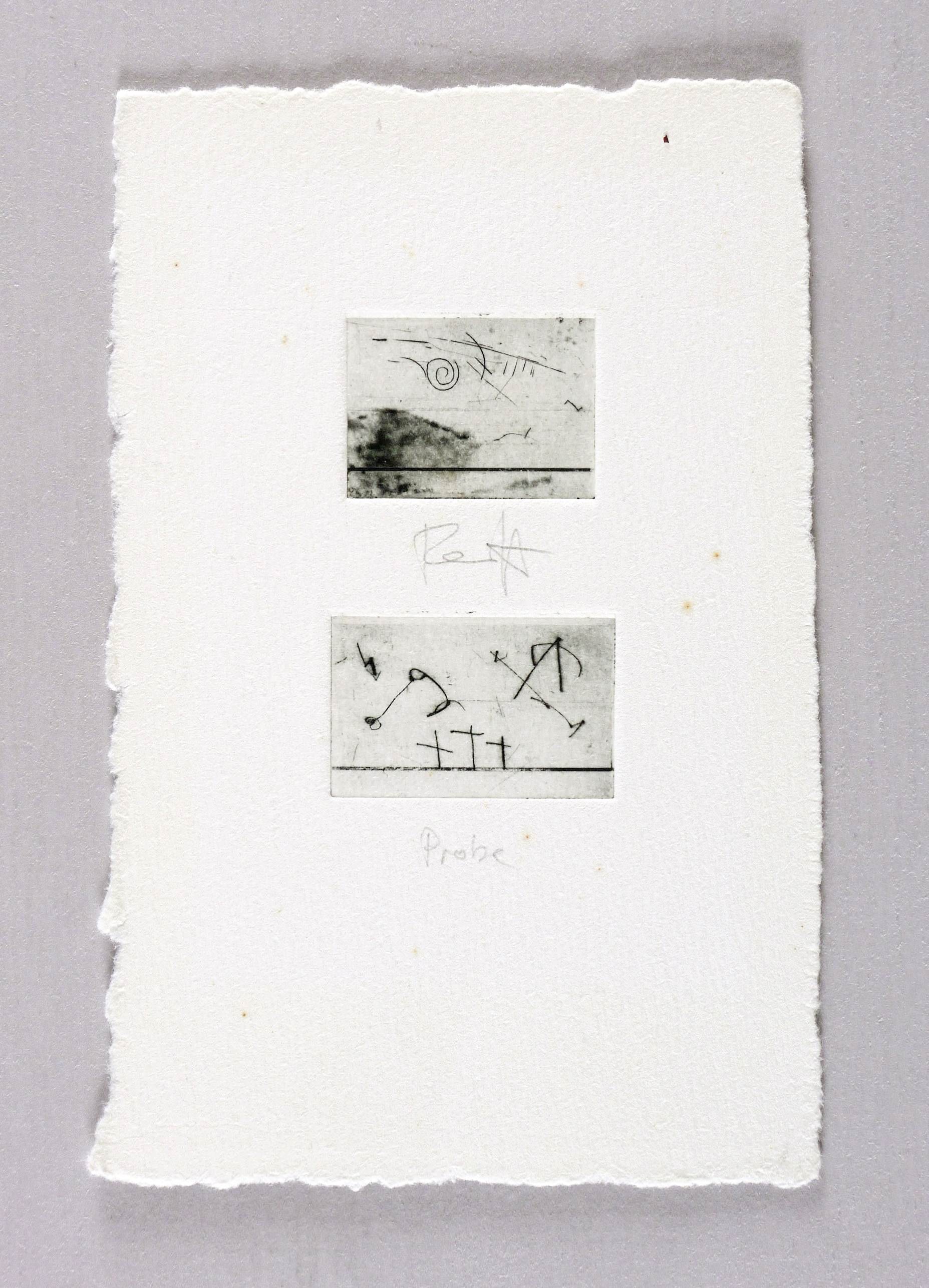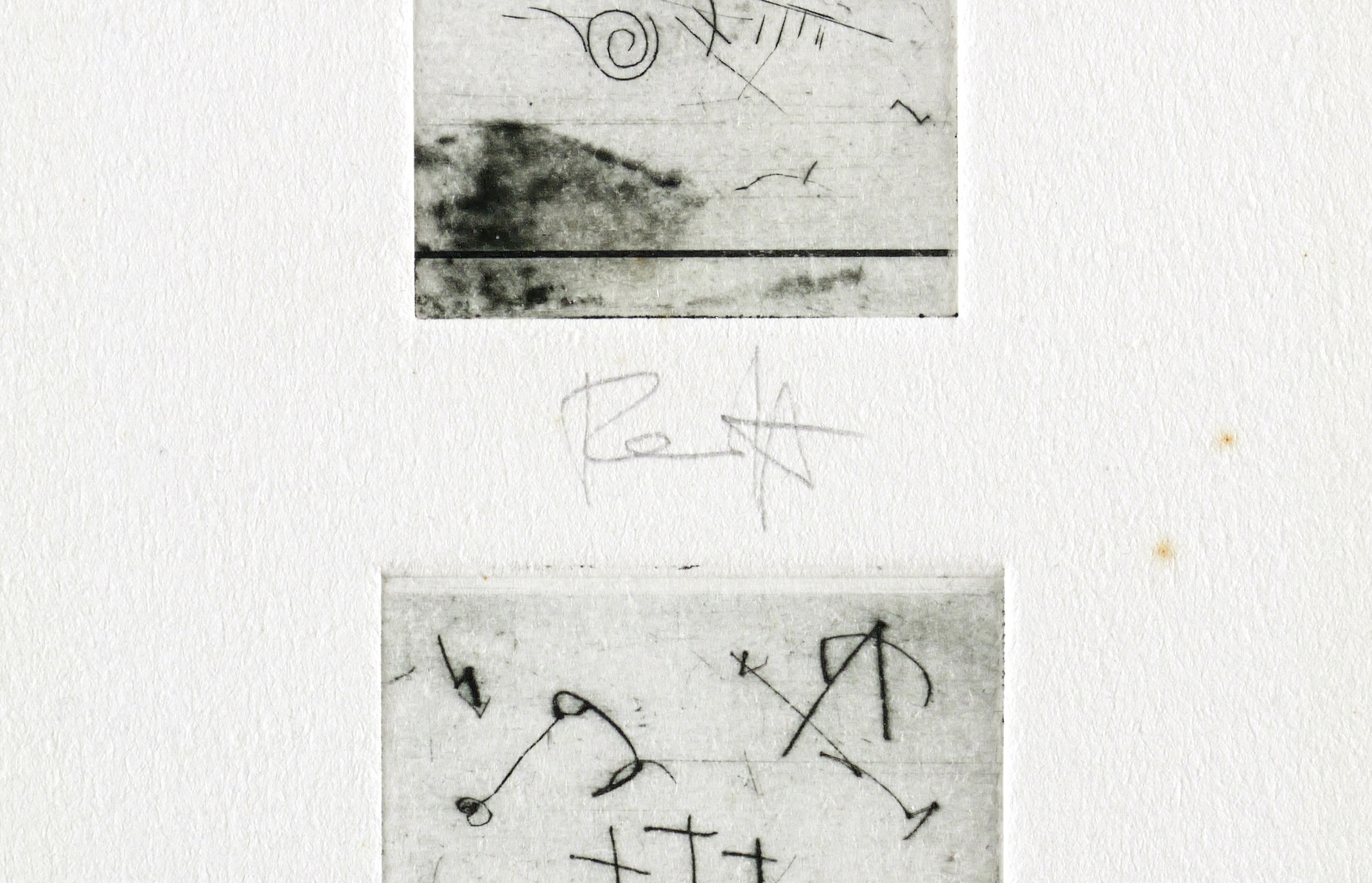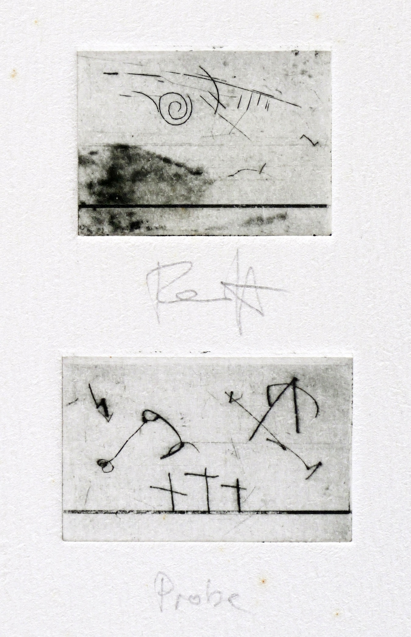 Um 1980. Radierung / Strichätzung, 2 Platten, auf 1 Bogen, auf Hahnemühle. – Originale Künstlergrafik, von Thomas Ranft. – Probedruck. – 2,4 x 3,1 cm (Darstellung / erste), 14 x 9 cm (Blatt), 2,3 x 3,6 cm (Darstellung / zweite).