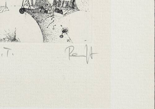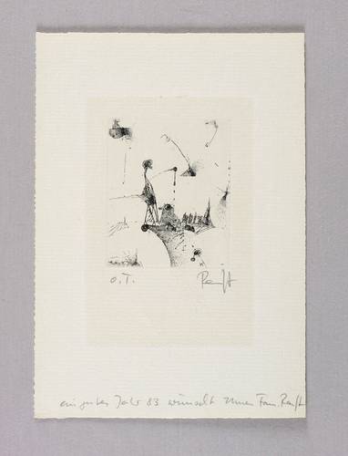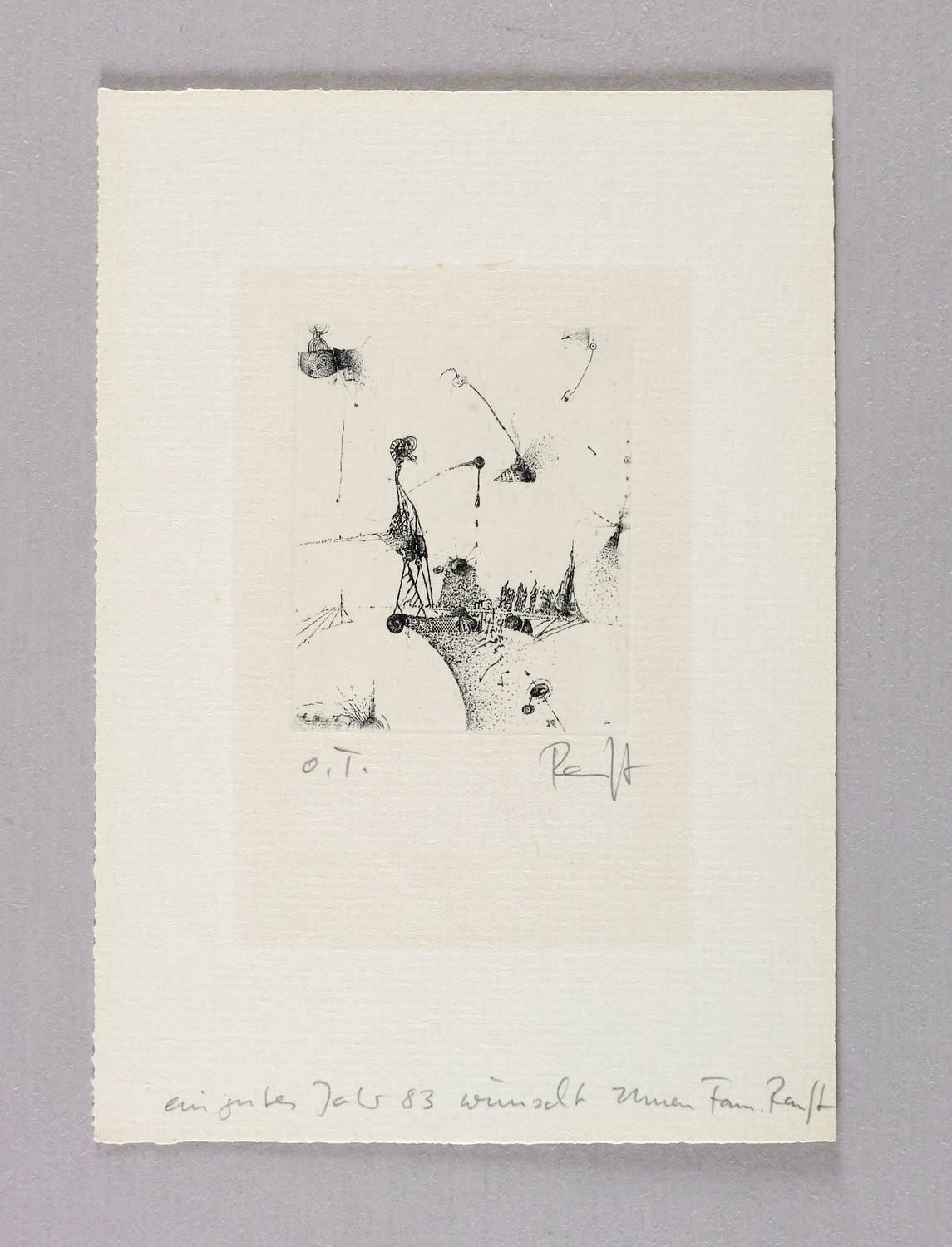 Rechts unten in Bleistift signiert: ″Ranft″. Links bezeichnet: ″o.T.″ Im unteren Blattrand Gruß: ″ein gutes Jahr 83 wünscht Ihnen Fam. Ranft″. – Leichter Lichtrand unter ehemaligem Passepartout-Ausschnitt. Mäßig guter Zustand.