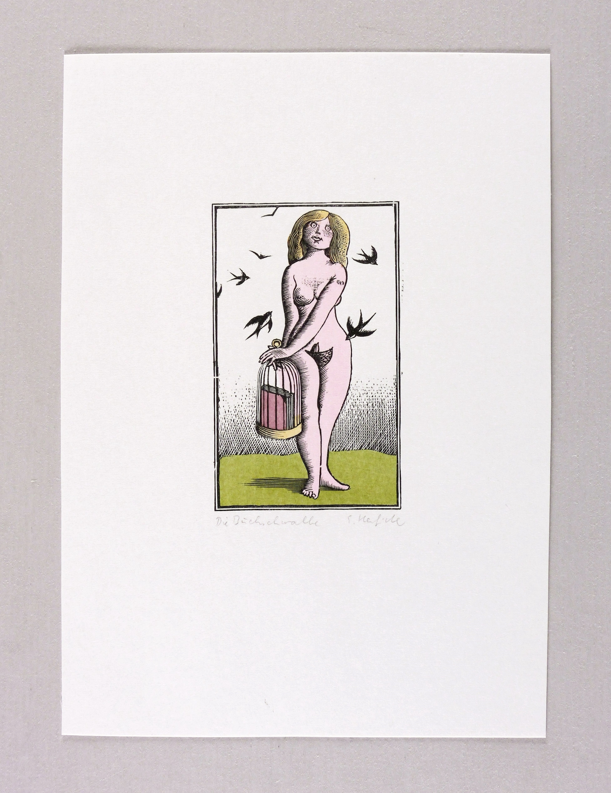 Um 1975. Farbholzschnitt, in 5 Farben, auf hellem Karton. – Originale Künstlergrafik, von Egbert Herfurth. – 8,0 x 4,9 cm (Darstellung / Druckbild), 18 x 13 cm (Blatt).