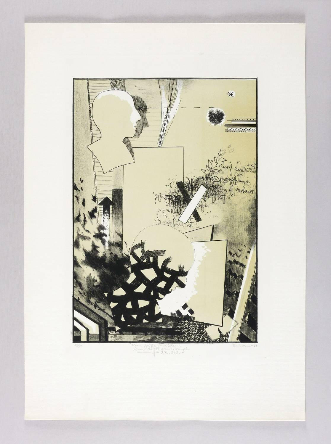1981. Tonlithografie / Kreidelithografie, in Schwarz, über sandfarbener Tonplatte, auf chamois Maschinenbütten. – Originale Künstlergrafik, von Bernhard Brückner. – Auflage Exemplar Nr. 30/35. – 32,1 x 22,6 cm (Darstellung / Druckbild), 48 x 35 cm (Blatt).