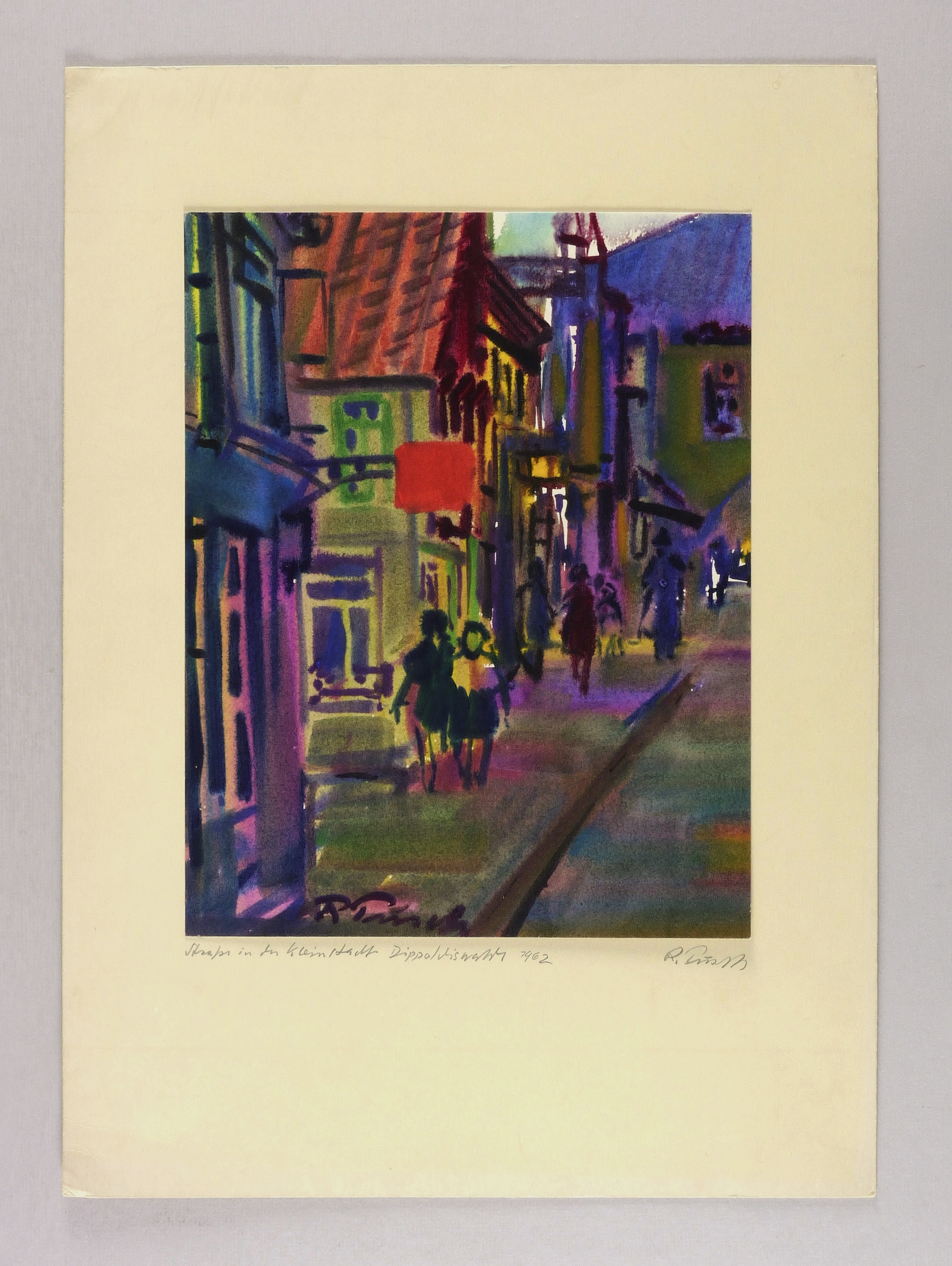 Auf dem Trägerkarton rechts unten in Bleistift signiert: ″R. Pusch″. Links Titel und Jahr: ″Straße in der Kleinstadt Dippoldiswalde 1962″. – Original vom Künstler auf Trägerkarton montiert. Sehr guter Zustand.
