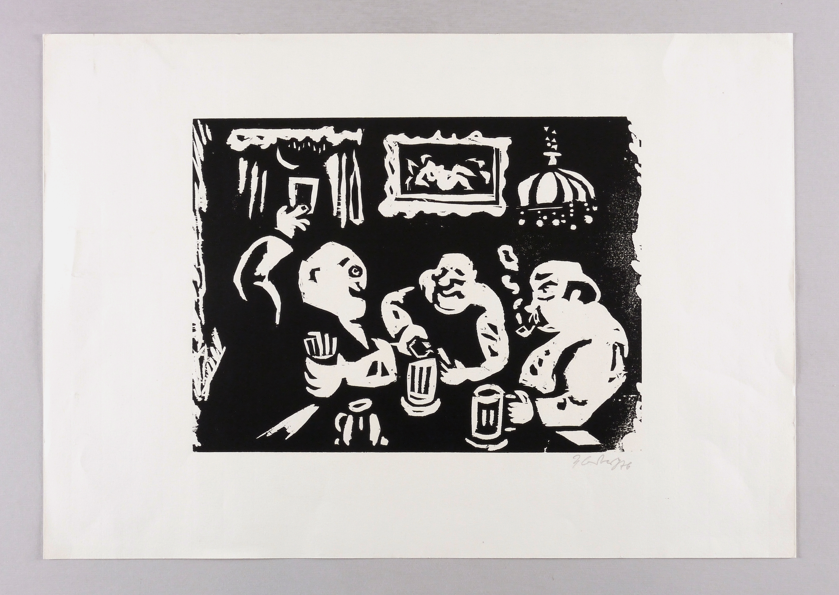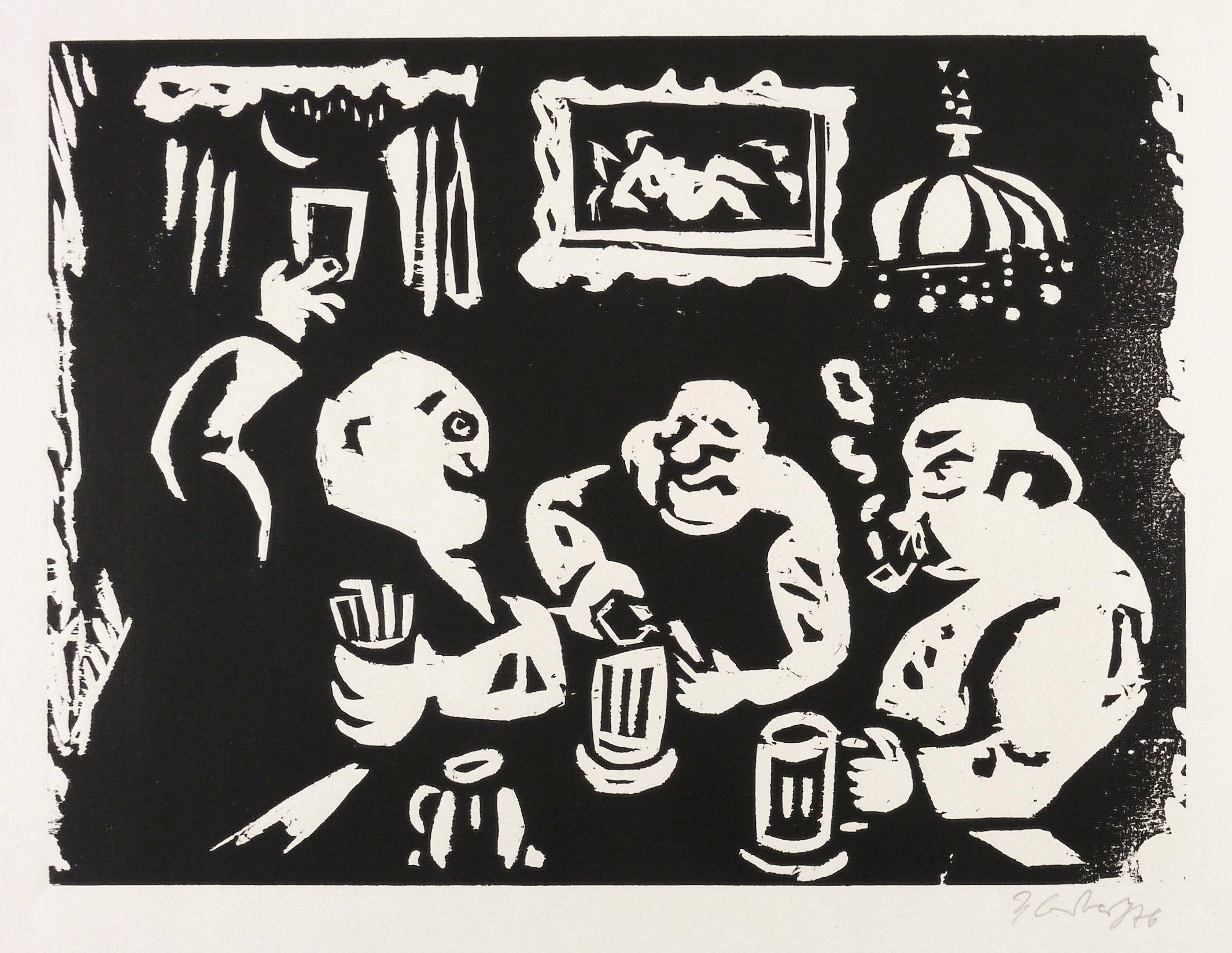 1976. Holzschnitt, in Schwarz, auf hartem hellchamois Maschinenbütten. – Originale Künstlergrafik, von Herbert Sandberg. – Künstlerexemplar (e.a.). – 26,8 x 35,9 cm (Darstellung / Druckstock), 42 x 60 cm (Blatt).