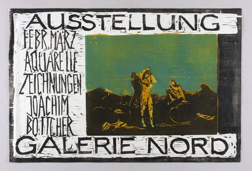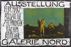 Rechts unten in Bleistift signiert und datiert: ″J. Böttcher 75″. Im Druckstock diverse Inschrift. – Originalgrafisches Künstlerplakat zur Ausstellung ″Joachim Böttcher. Aquarelle, Zeichnungen″ in der Galerie Nord in Dresden Februar-März 1975. – Kleine Randrisse hinterlegt. Guter Zustand.