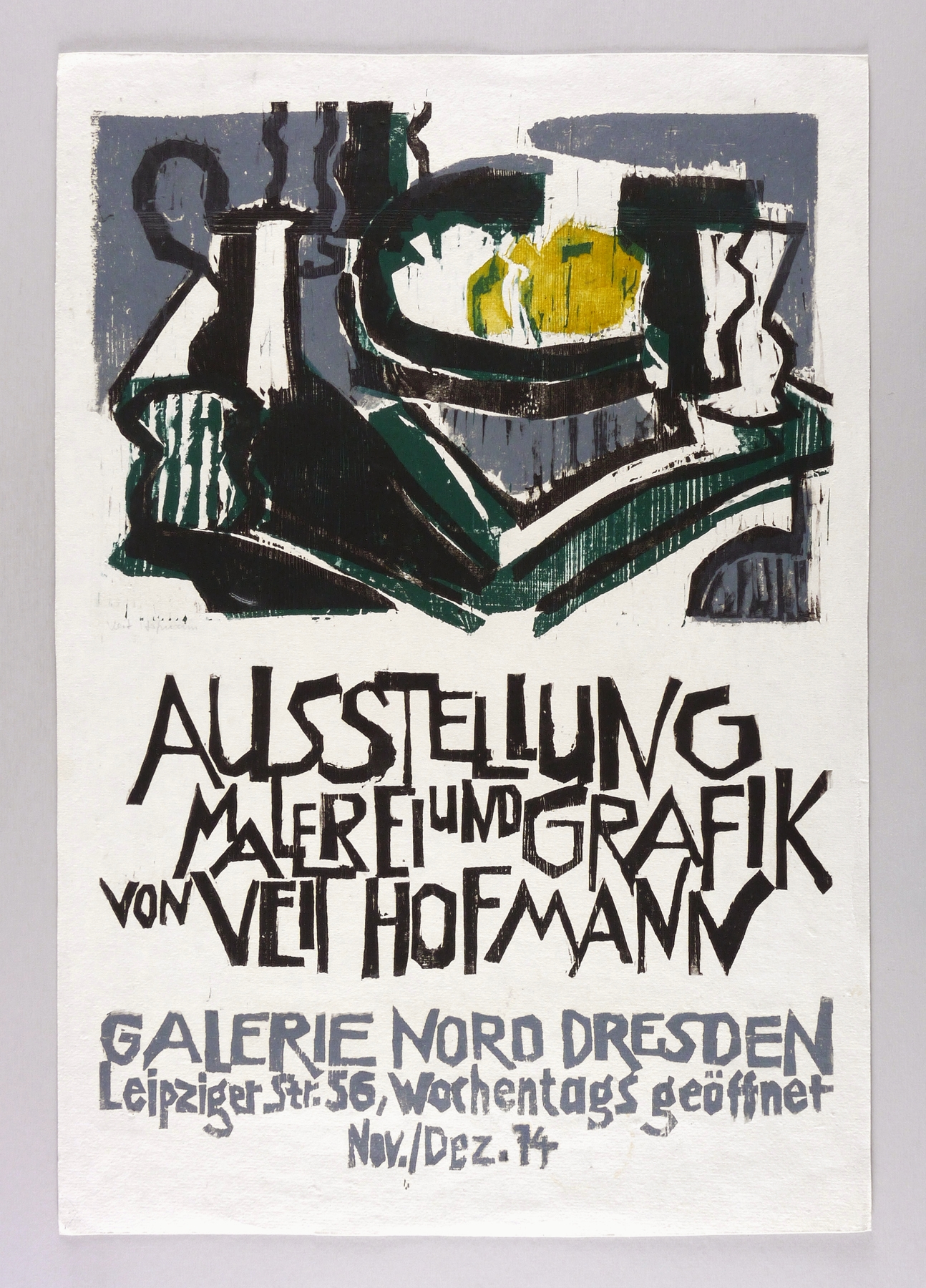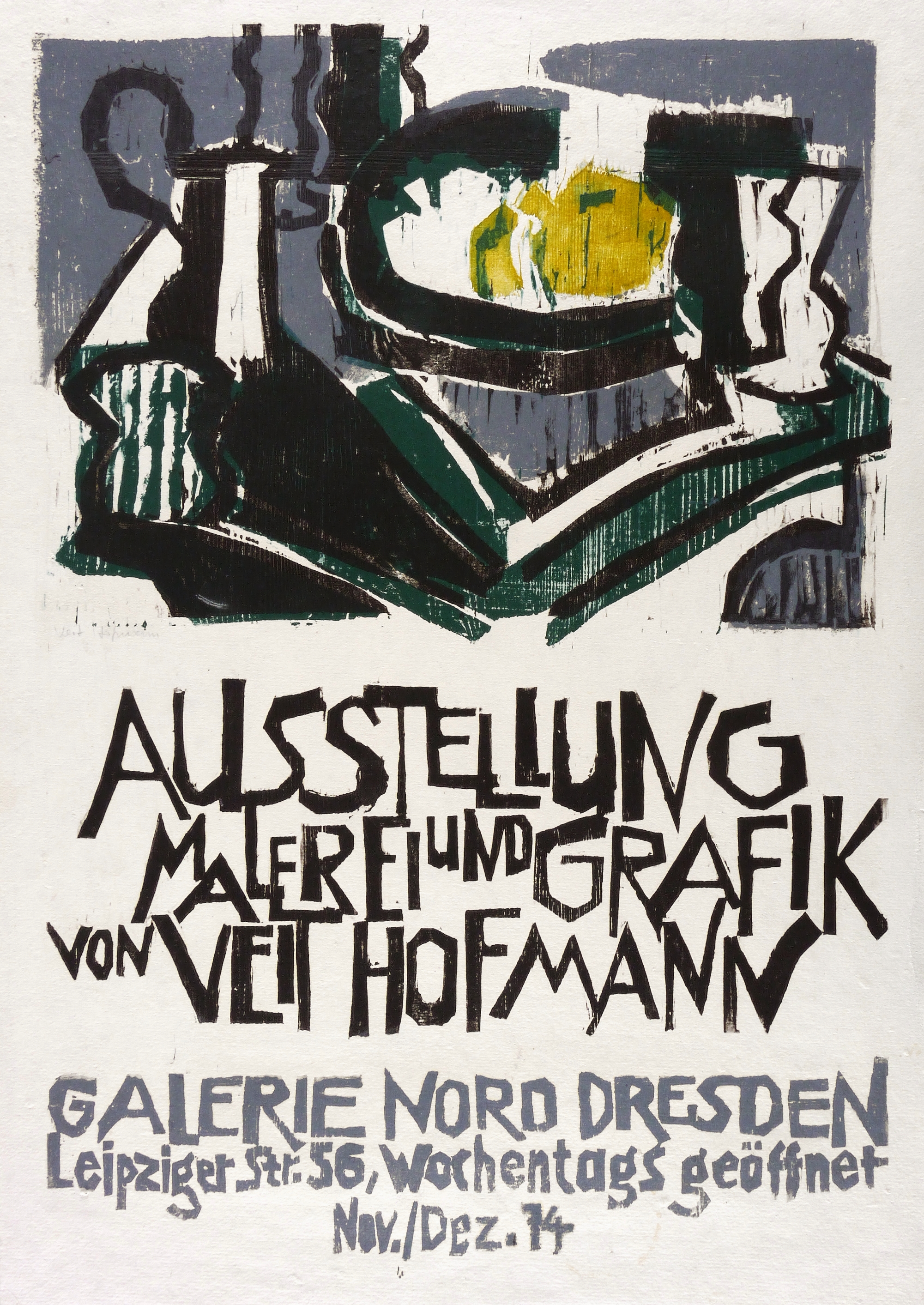 Links unten in Bleistift signiert: ″Veit Hofmann″. Im Druckstock diverse Inschriften. – Originalgrafisches Plakat zur Ausstellung ″Malerei und Grafik von Veit Hofmann″ November bis Dezember 1974 in der Galerie Nord in Dresden. – Leichte Alters- und Lagerspuren. Guter Zustand.
