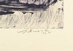 WVZ 442. – Rechts unten in Bleistift signiert und datiert: ″Werkmeister 94″. Links Auflagenbezeichnung und Titel. In der Blattecke rechts unten Trockenstempel: ″WERKMEISTER DRUCK″. – Papier in den Blattkanten etwas angegilbt. Vor allem im äußeren Rand winzige Fleckchen von Eiseneinschlüssen im Bütten. Insgesamt mäßig guter Zustand.
