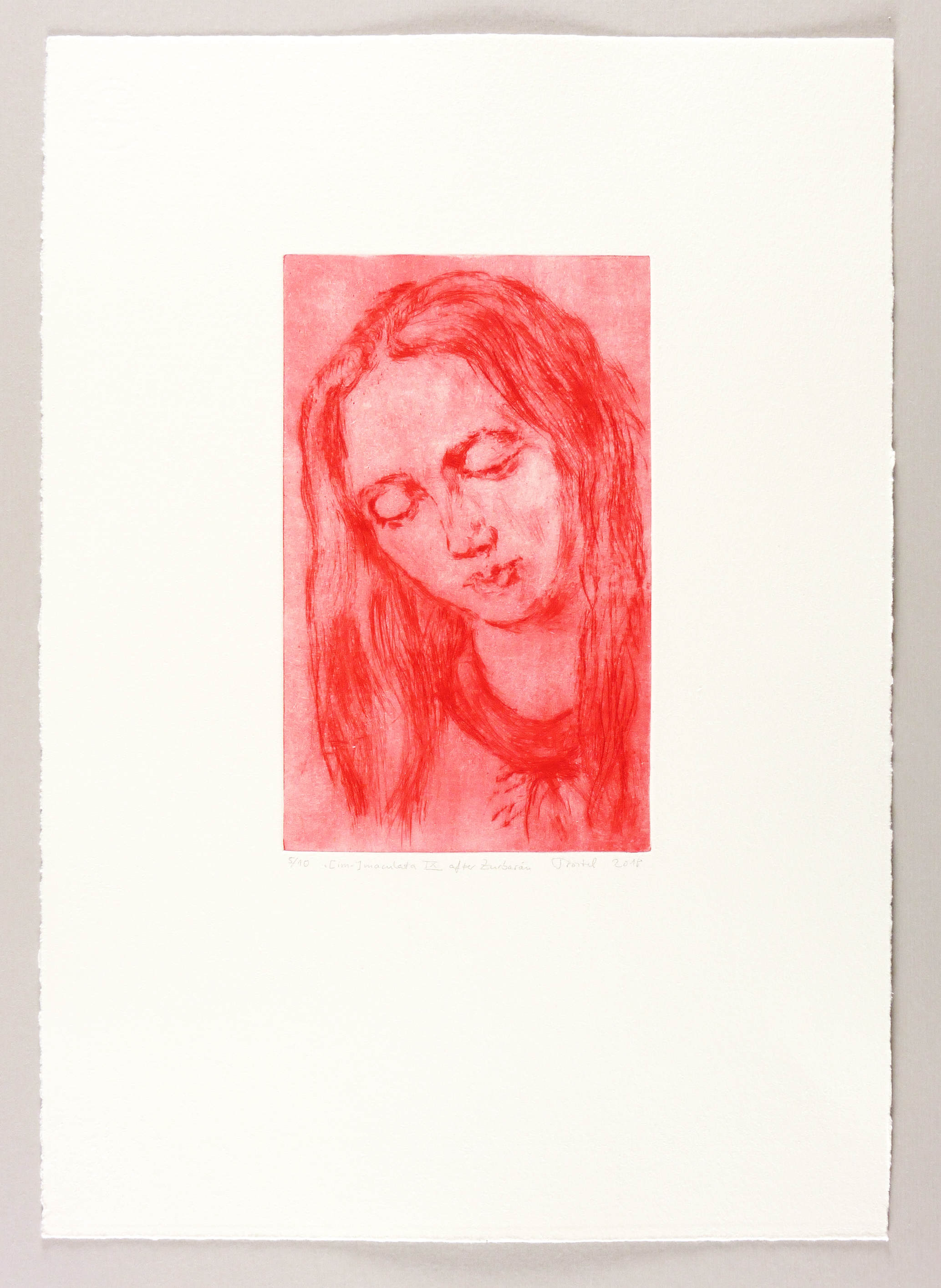 2018. Radierung / Kaltnadel, in Rot, auf Hahnemühle-Bütten. – Originale Künstlergrafik, von Iris Trostel-Santander. – Auflage Exemplar Nr. 5/10. – 24,8 x 15,3 cm (Darstellung / Platte), 50 x 35 cm (Blatt).