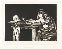 Rechts unten in Bleistift signiert und datiert. Links davon Titel und Auflagenbezeichnung. – Feministische Persiflage auf das Caravaggio- Gemälde ″Der Hl. Hieronymus beim Schreiben″ (1605/06) in der Galleria Borghese in Rom. – Sehr guter Zustand.