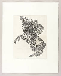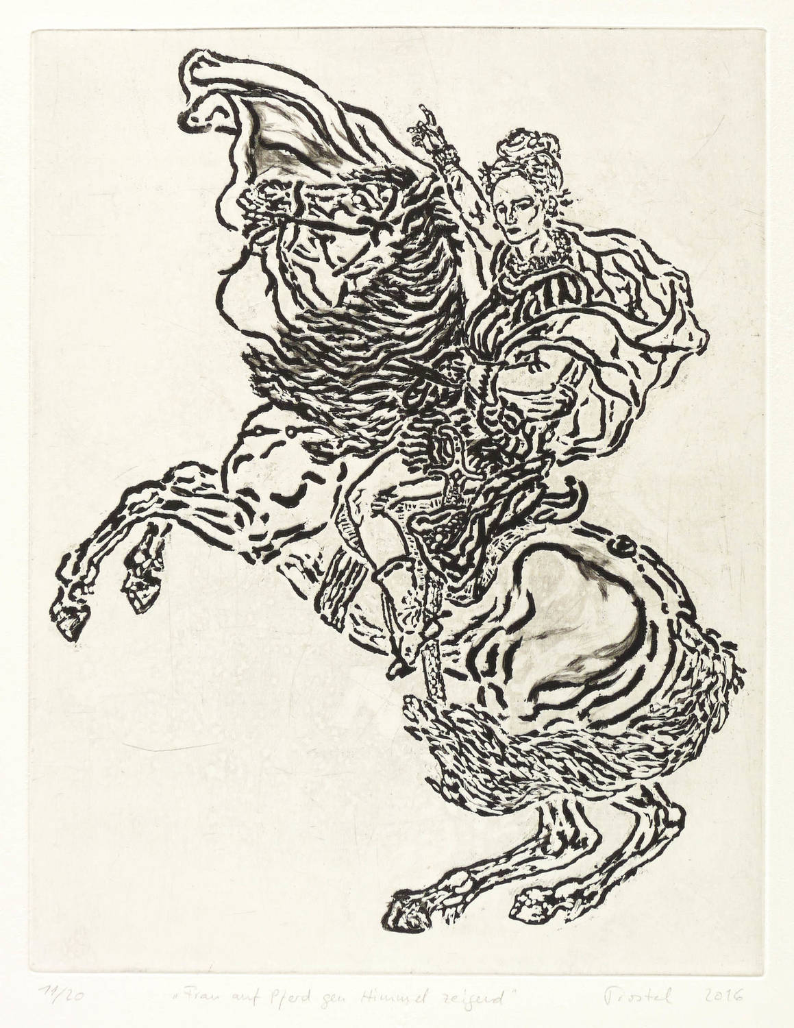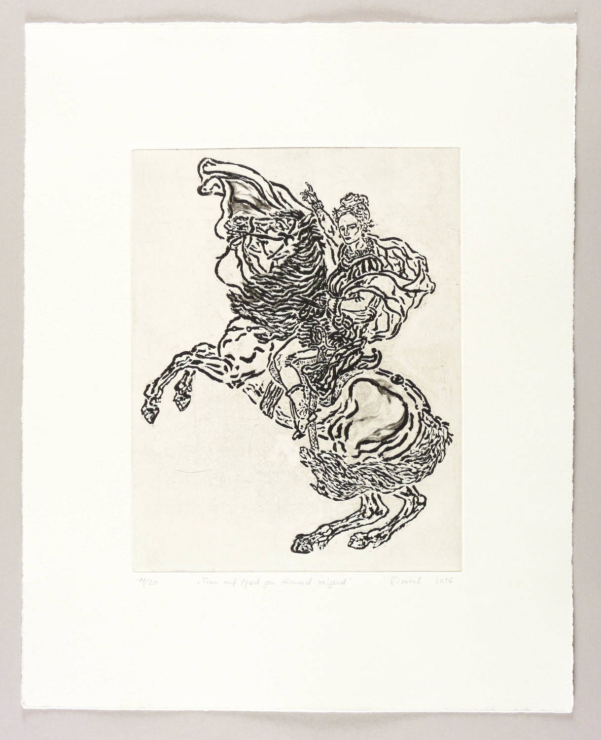Rechts unten in Bleistift signiert und datiert. Links davon Titel und Auflagenbezeichnung. – Feministische Persiflage auf das Reiterbild ″Bonaparte beim Überschreiten der Alpen am Großen Sankt Bernhard ″ von Jacques-Louis David (1800), das sich in verschiedenen Versionen u.a. in den Sammlungen von Schloss Charlottenburg, Schloss Versailles oder auch im Belvedere in Wien befindet und zu den ikonischen Herrscherbildern der Welt gehört. – Sehr guter Zustand.