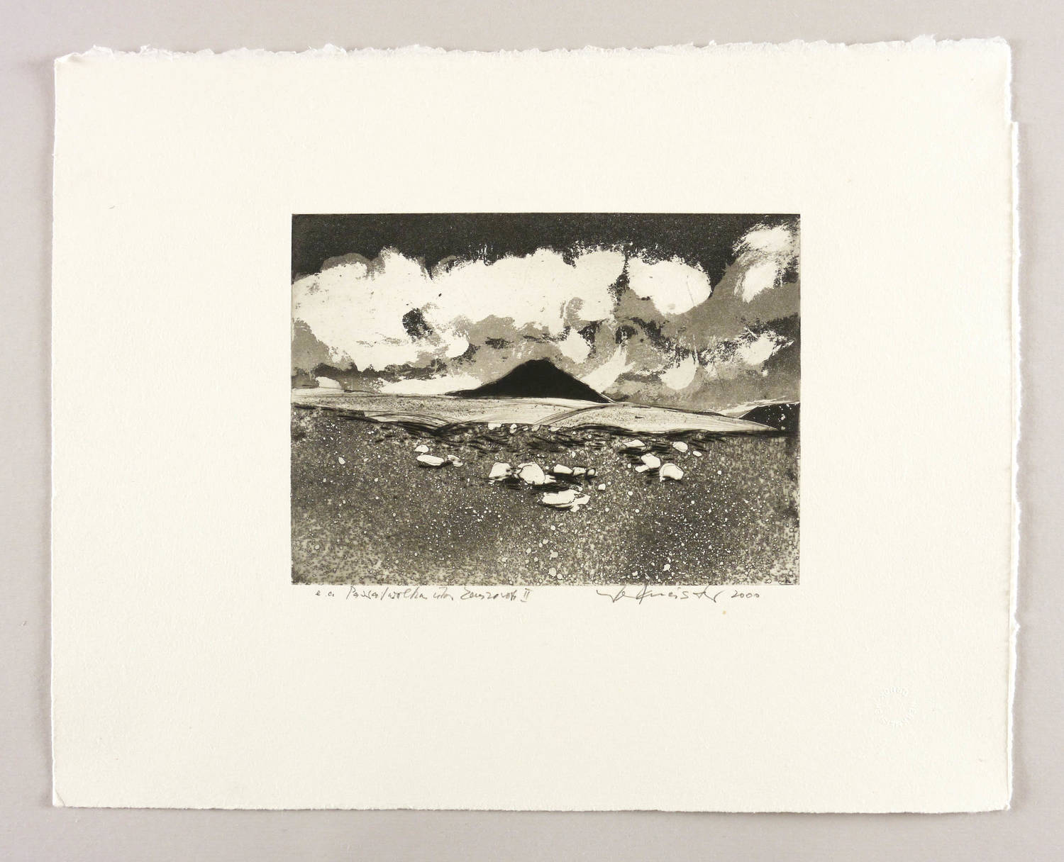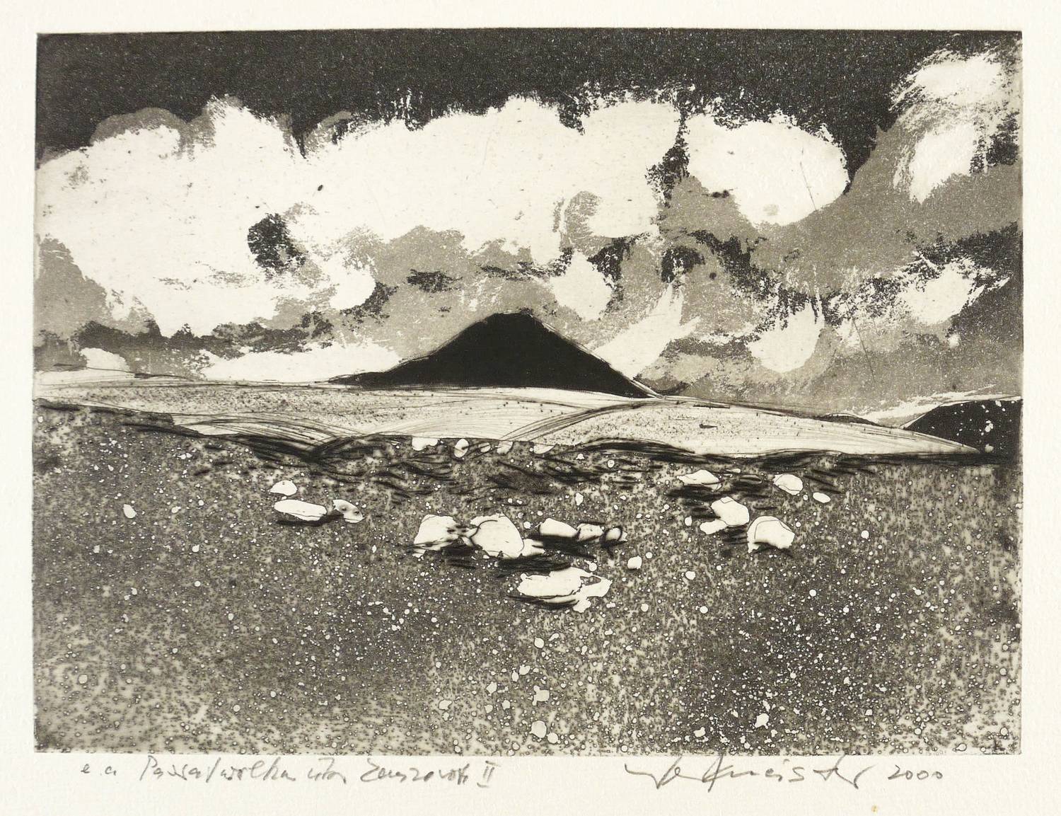 Wolfgang Werkmeister (*1941 Berlin, lebt und arbeitet in Hamburg). Deutscher Grafiker, bedeutender Vertreter der zeitgenössischen Radierkunst. 1960-64 Besuch der Akademie der Bildenden Künste Stuttgart, Fachklasse für freie Grafik und Illustration bei Gunther Böhmer. 1965 Besuch der Fachhochschule für Gestaltung Hamburg bei W. M. Busch und S. Oelke. 1966-68 tätig als Pressezeichner. 1972/73 Dozent an der Fachhochschule für Gestaltung, Hamburg. Zahlreiche Auslanfsaufenthalte und Stipendien in Marokko, USA, auf den Kanarischen Inseln, etc. 2001 Kunstpreis der Stadt Baden-Baden. Zentrales Ausdrucksmittel ist die Radierung, genauer die Aquatinta, in der er Landschaft als Hauptmotiv regelrecht zelebriert und in technisch ebenso aufwändigen wie raffinierten Blättern druckgrafisch umsetzt. Stilistisch siedelt sein Werk zwischen einem geschickt eingesetzten Fotorealismus und der lakonischen Bildsprache eines Ansel Adams.