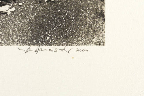 2000. Radierung / Aquatinta, Reservage & Kaltnadel, in Schwarz, auf hellgelbem Velinkarton. – Von Wolfgang Werkmeister. – Künstlerexemplar (e.a.). – 14,5 x 19,7 cm (Darstellung / Platte), 30 x 38 cm (Blatt).