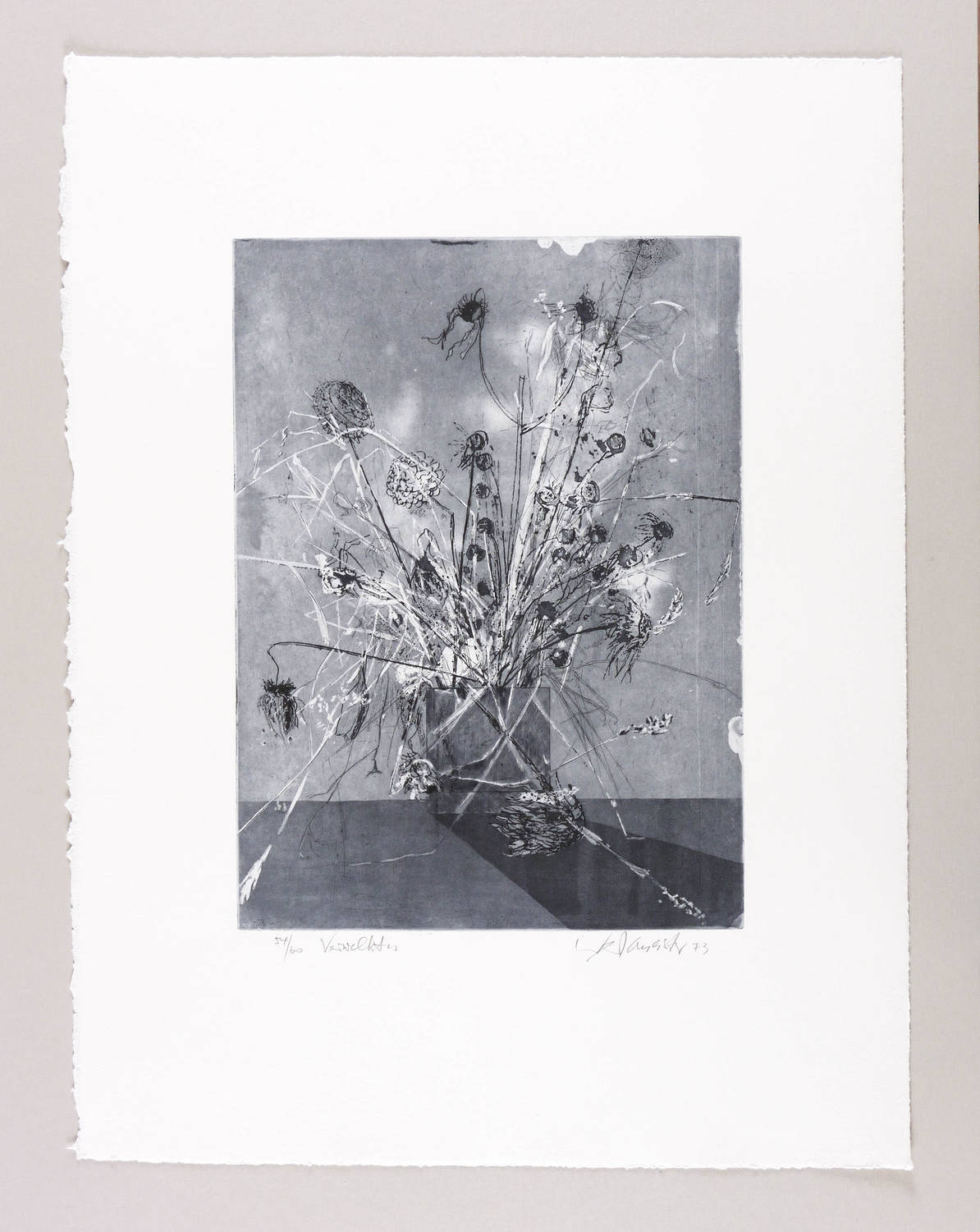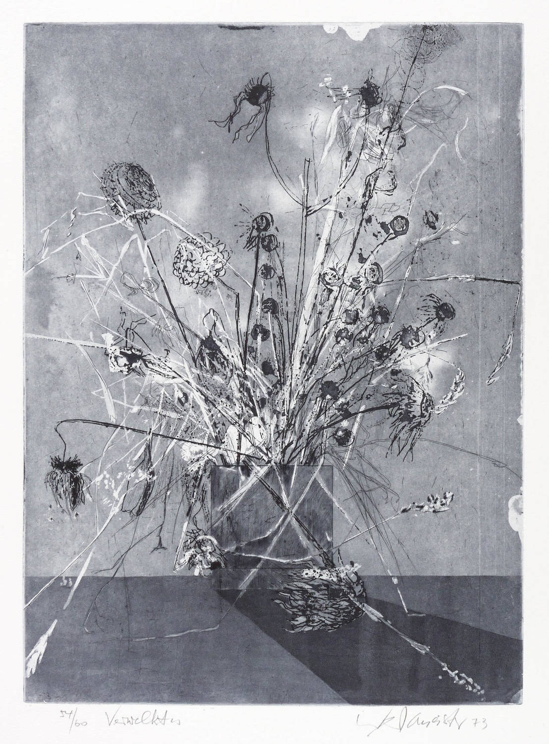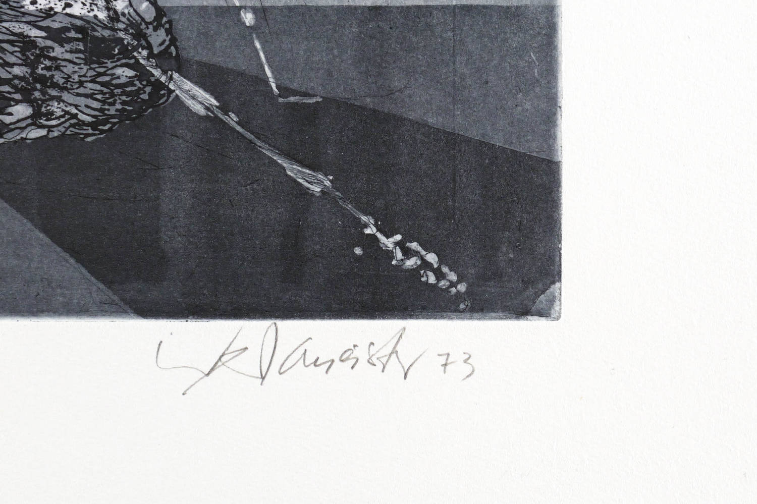 1973. Radierung / Reservage, Aquatinta & Kaltnadel, partiell poliert, in Schwarz, auf weißem Hahnemühle-Bütten. – Von Wolfgang Werkmeister. – Auflage Exemplar Nr. 54/60. – 35,7 x 26,2 cm (Darstellung / Platte), 57 x 43 cm (Blatt).