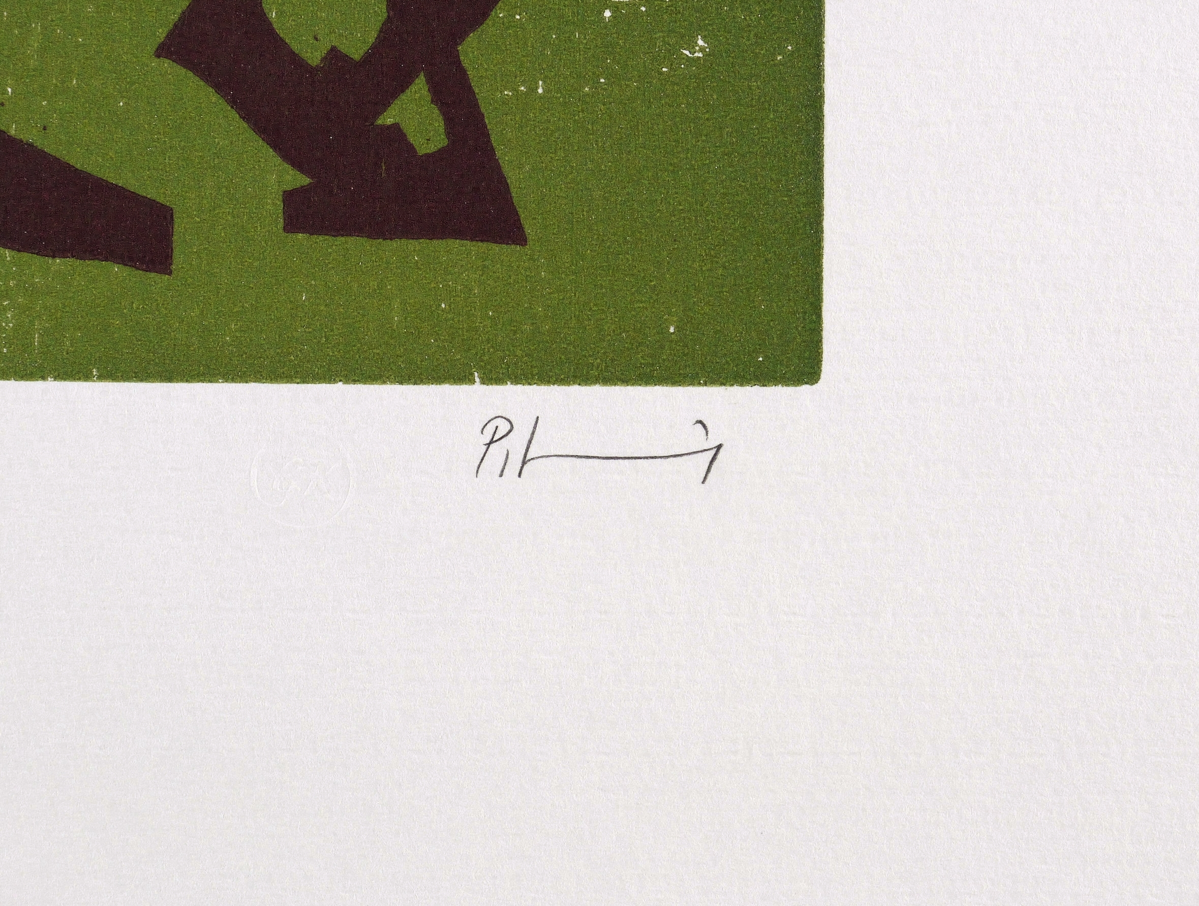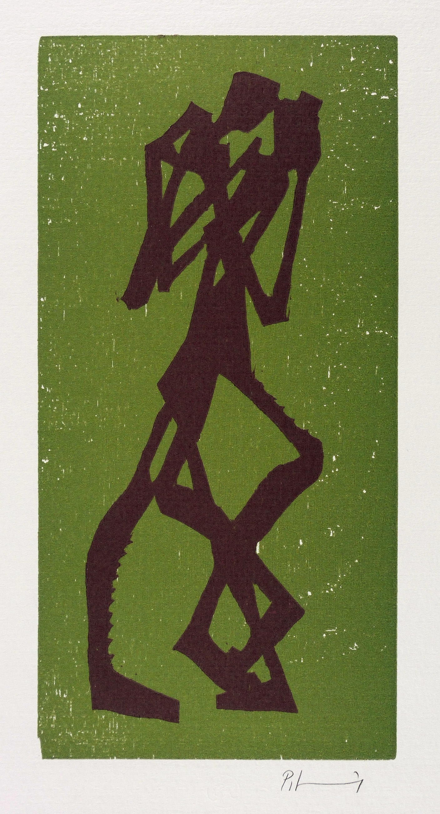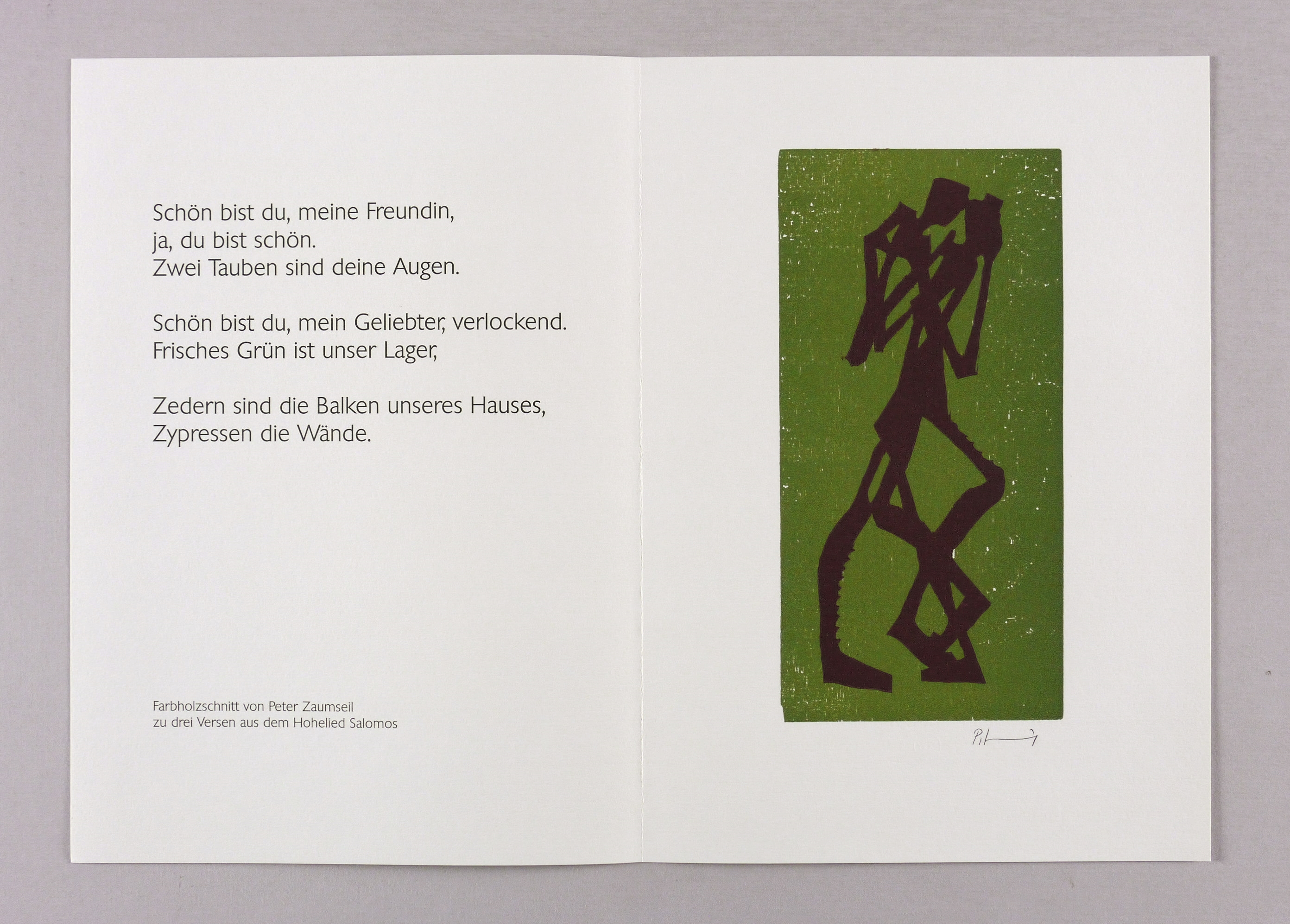 2006. Farbholzschnitt, in Olivegrün & Schwarz, auf hellem Velinkarton. – Originale Künstlergrafik, von Peter Zaumseil. – 21,0 x 10,4 cm (Darstellung / Druckstock), 30 x 21 cm (Blatt).