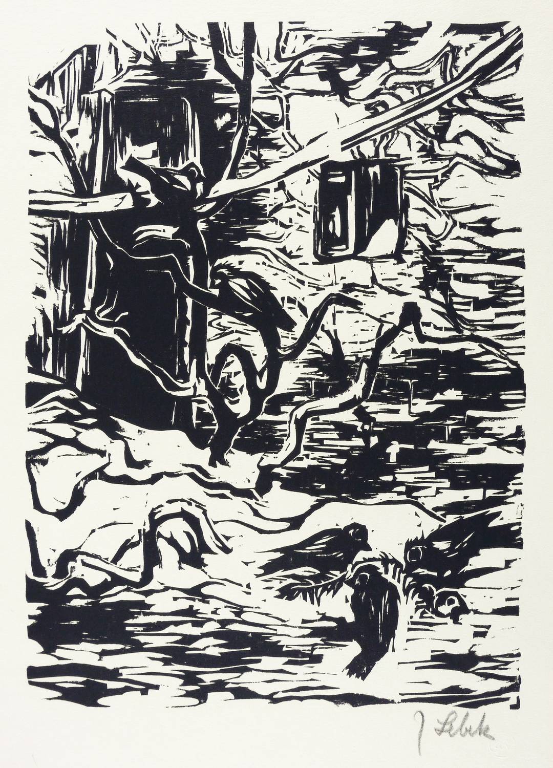 1977. Holzschnitt, in Schwarz, auf hellgelbem Velin. – Originale Künstlergrafik, von Johannes Lebek. – 25,9 x 18,8 cm (Darstellung / Druckstock), 31 x 22 cm (Blatt).