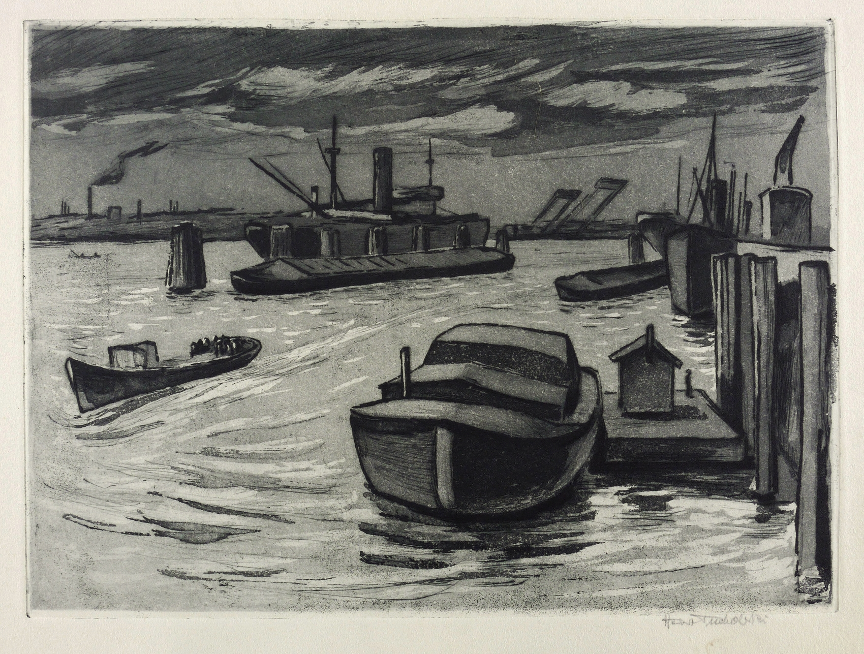 Rechts unten in Bleistift signiert: ″Herbert Tucholski″. Verso in einer Blattecke fremd bezeichnet: ″Hamburger Hafen / RAq / überarb. R. v. 1928″. – Seltene Aquatinta-Radierung in der 1965 überarbeiteten Variante. – Nicht im Werkverzeichnis von Rolf Karnahl. – Originalrandiges Exemplar. Im unteren Blattrand rechts schwach ausgeprägter Wasserrand. Sonst sehr guter Zustand.
