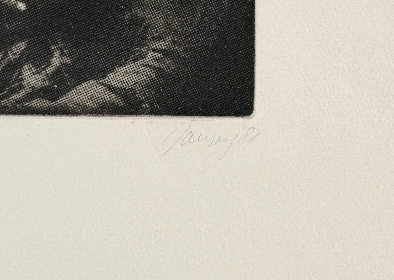 1981. Farbradierung / Rasterätzung, in Violett-Schwarz & Schwarz, nach Fotomontage, auf hellgelbem Velinkarton. – Originale Künstlergrafik, von Joachim Jansong. – Auflage Exemplar Nr. 29/35. – 33,4 x 23,4 cm (Darstellung / Platte), 48 x 34 cm (Blatt).