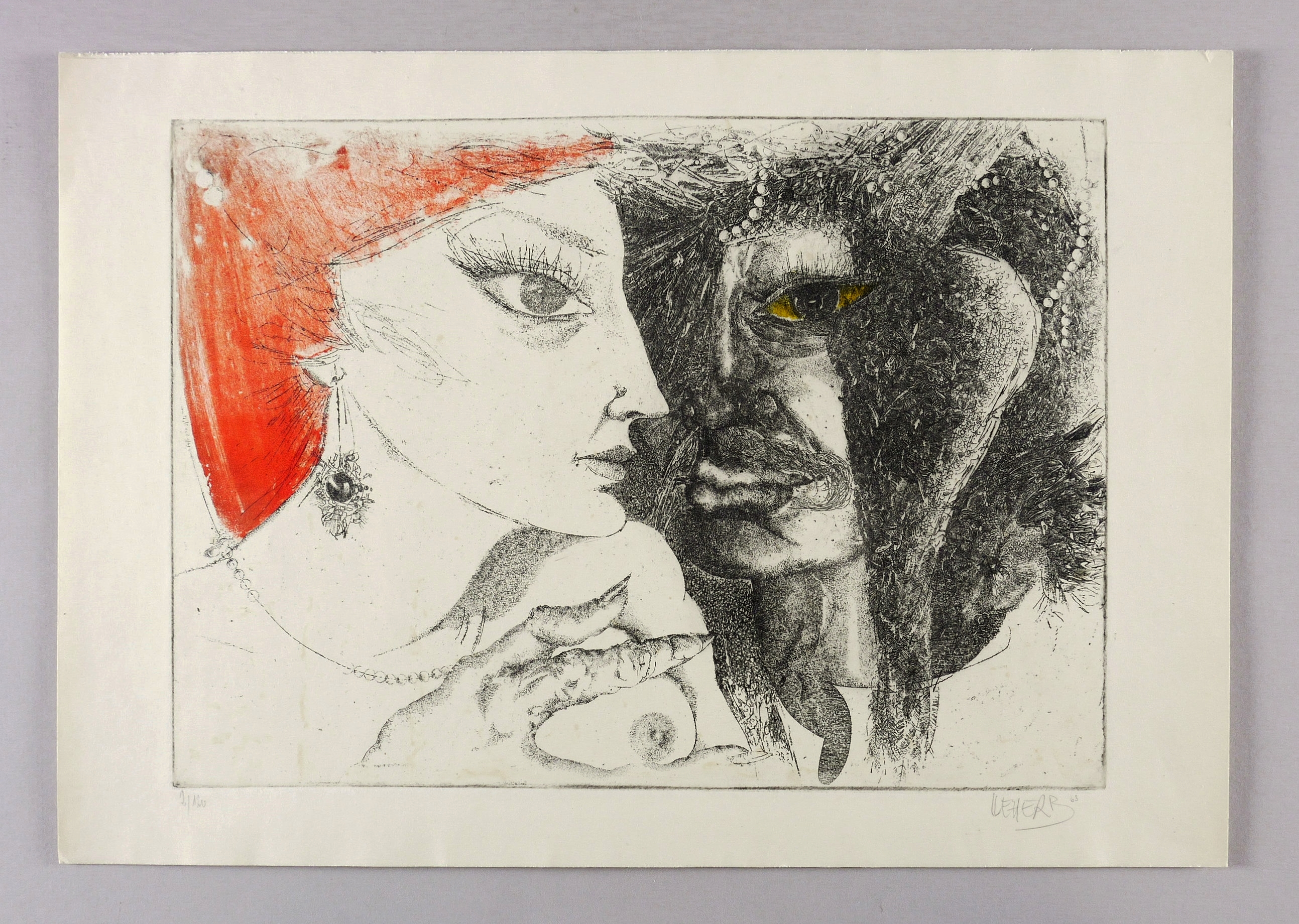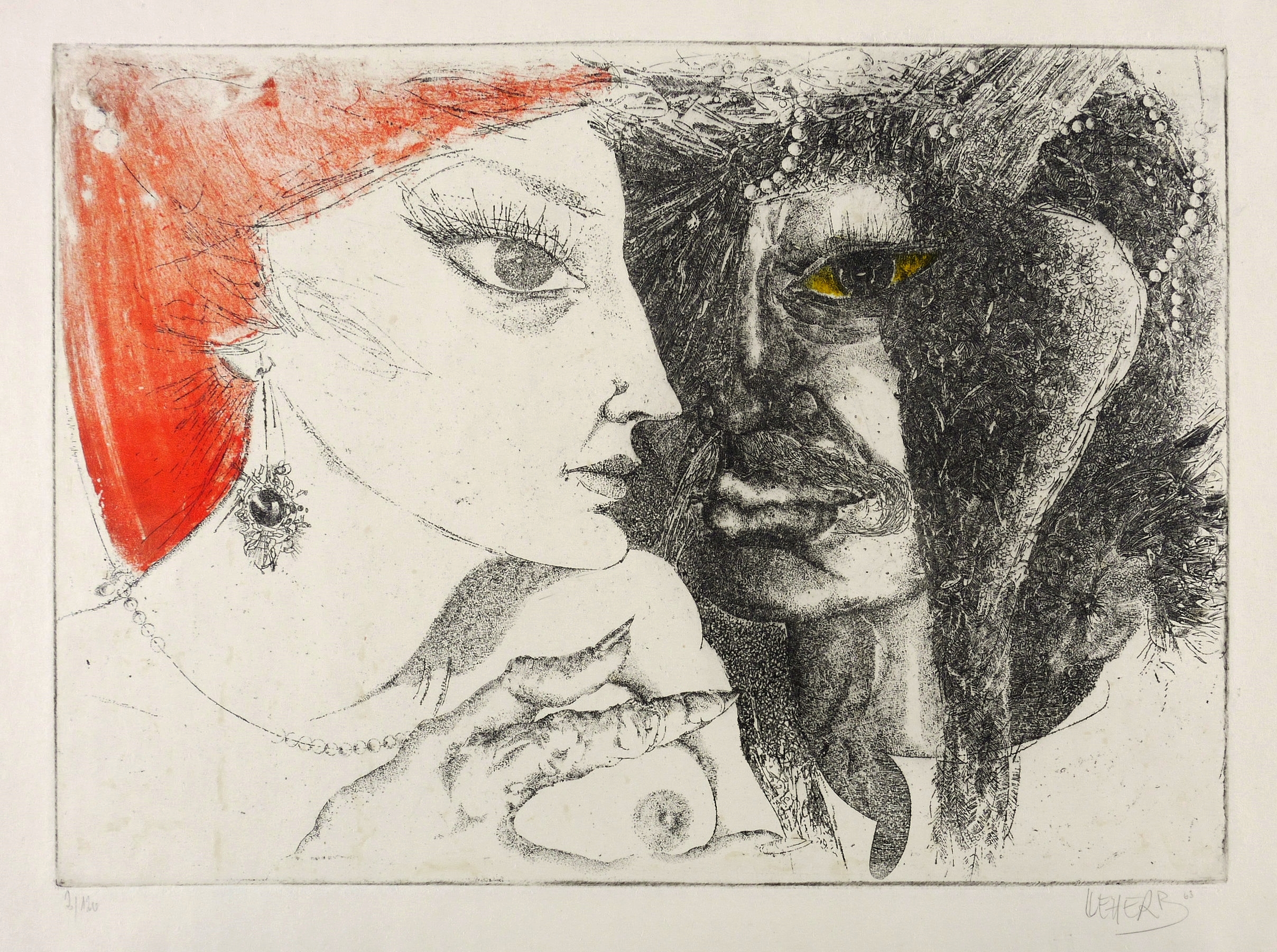 1963. Farbradierung / Strichätzung & Aquatinta, in Hellrot, Gelb & Schwarz, auf hellchamois Velinkarton. – Originale Künstlergrafik, von Leherb, Helmut. – Exemplar Auflage Nr. 2/120. – 29,0 x 40,3 cm (Darstellung / Platte), 36 x 51 cm (Blatt).