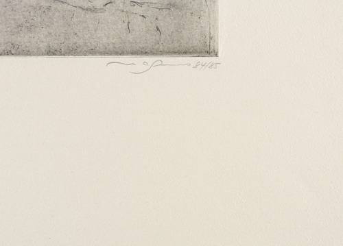 1984/1985. Radierung / Strichätzung, in Schwarz, mit Plattenton, auf festem chamois Hahnemühle. – Originale Künstlergrafik, von Klaus Magnus. – Auflage Exemplar Nr. 73/100. – 22,6 x 20,7 cm (Darstellung / Platte), 54 x 39 cm (Blatt).