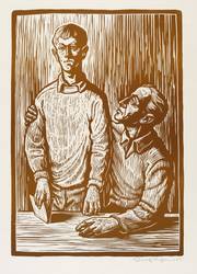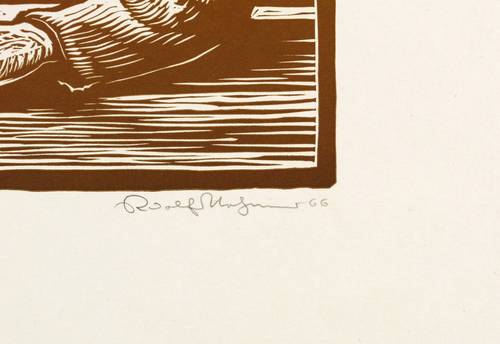 1966. Farbholzschnitt, in Hell- & Dunkelbraun, auf glattem hellgelbem Velin. – Originale Künstlergrafik, von Rudolf Nehmer. – 31,1 x 21,8 cm (Darstellung / Druckstock), 56 x 42 cm (Blatt).