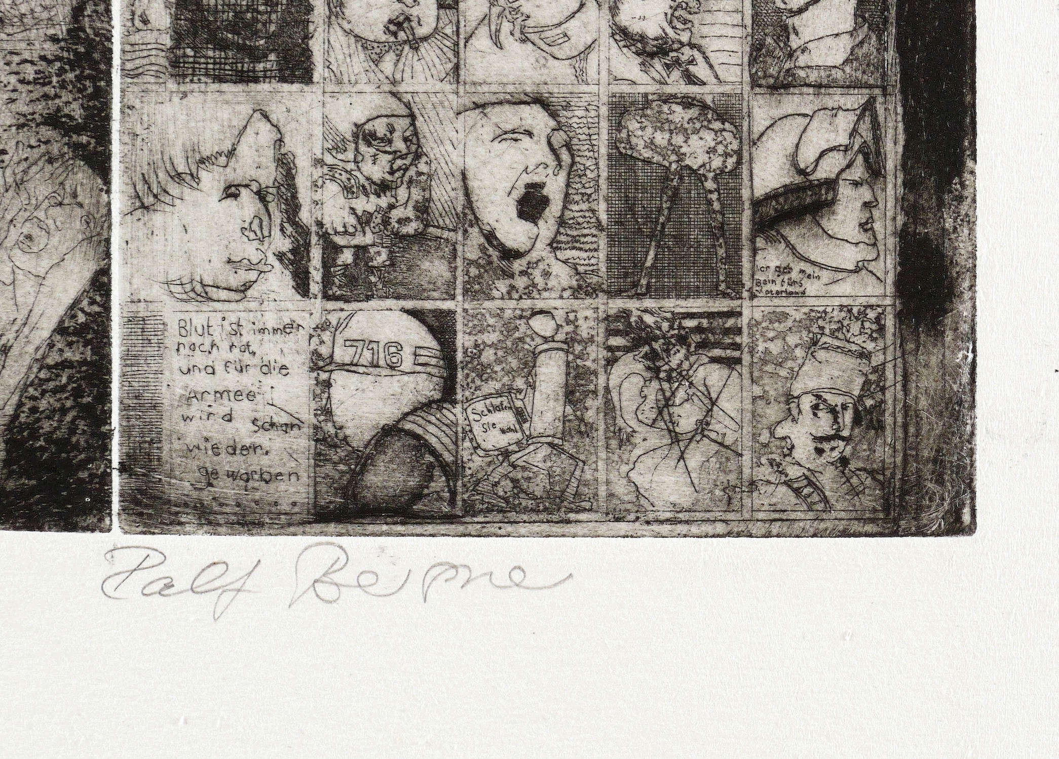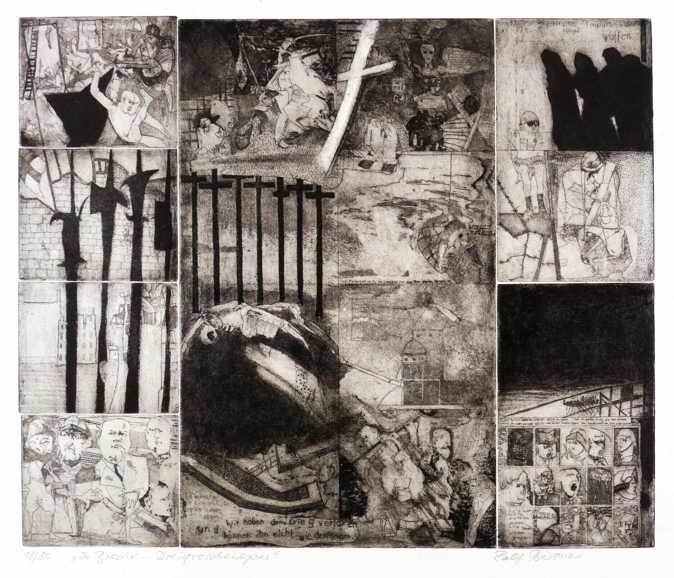 Rechts unten in Bleistift signiert: ″Ralf Bergner″. Links unten Auflagenbezeichnung und Titel: ″18/30 'zu Brecht - Dreigroschenoper'″. – Zusammendruck von 7 Platten auf einem Blatt. – Tadellos. Sehr guter Zustand.