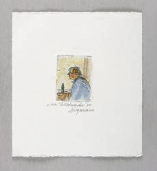 2016. Radierung / Strichätzung, in Schwarz, aquarelliert, auf hellchamoise Velin. – Originale Künstlergrafik, von Ulrich Jungermann. – Auflage Exemplar Nr. 3/4. – 6,4 x 4,8 cm (Darstellung / Platte), 20 x 18 cm (Blatt).