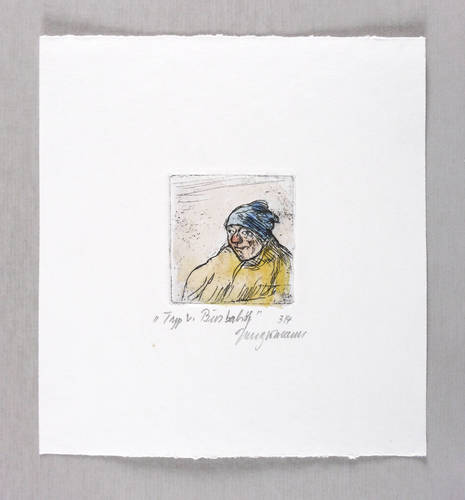 2016. Radierung / Strichätzung, in Schwarz, aquarelliert, auf weißem Velin. – Originale Künstlergrafik, von Ulrich Jungermann. – Auflage Exemplar Nr. 3/4. – 5,8 x 5,5 cm (Darstellung / Platte), 19 x 17 cm (Blatt).