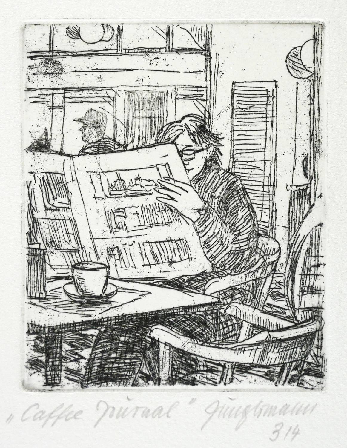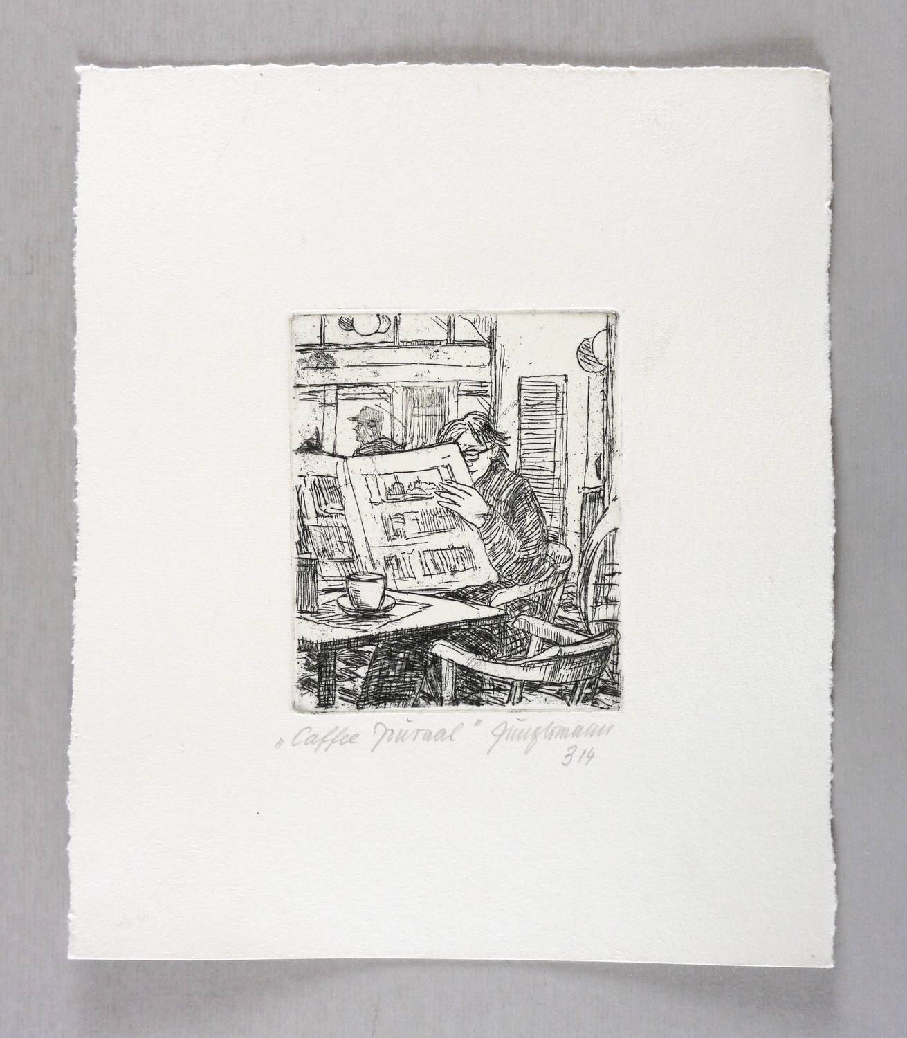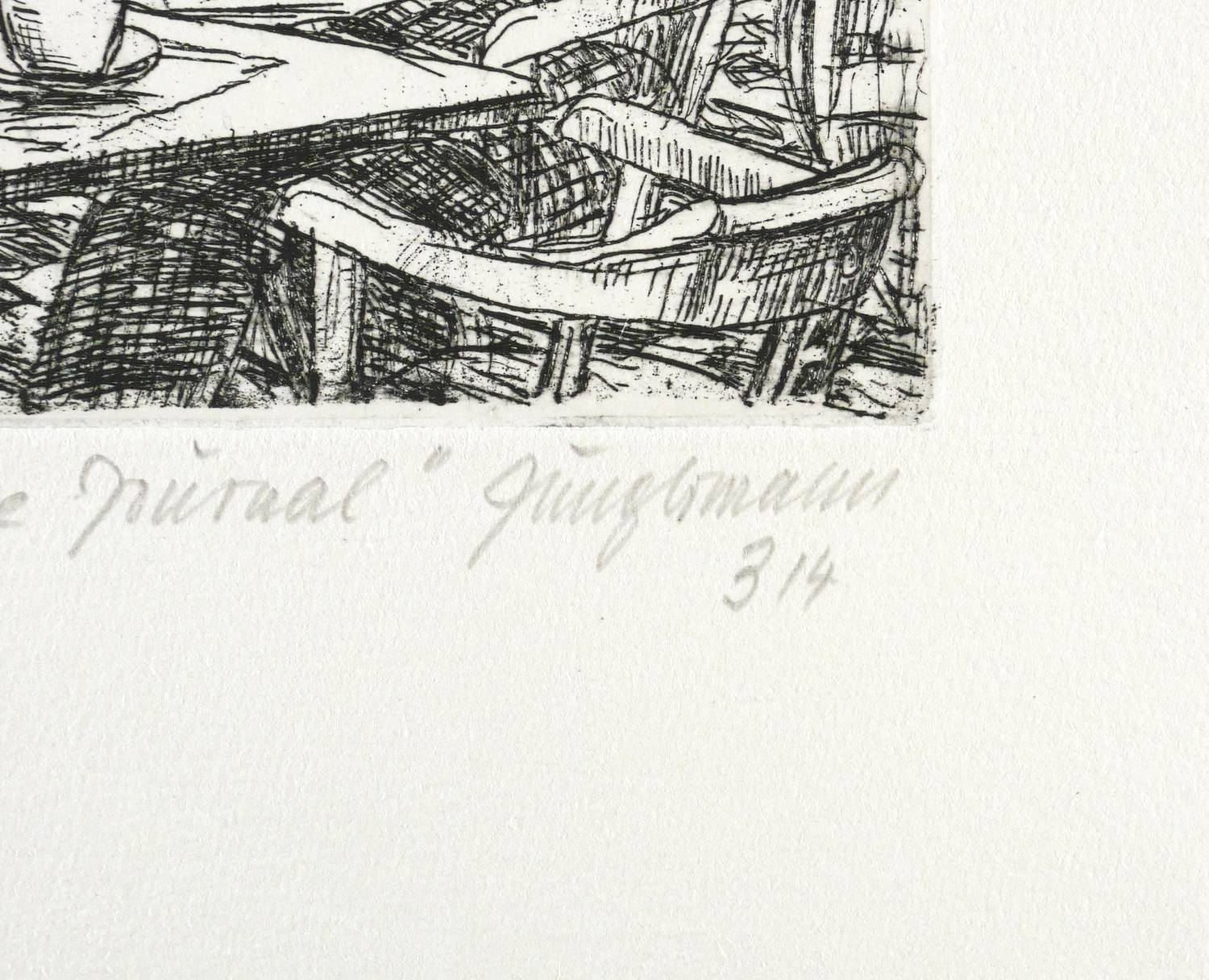 2018. Radierung / Strichätzung, in Schwarz, auf hellchamois Velin. – Originale Künstlergrafik, von Ulrich Jungermann. – Auflage Exemplar Nr. 3/4. – 12,0 x 9,8 cm (Darstellung / Platte), 27 x 23 cm (Blatt).
