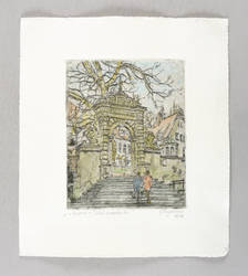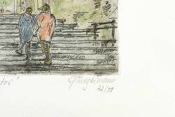 1995. Radierung / Kaltnadel, in Schwarz, aquarelliert, auf hellchamois Velin. – Originale Künstlergrafik, von Ulrich Jungermann. – Auflage Exemplar Nr. 22/50. – 19,9 x 15,9 cm (Darstellung / Platte), 32 x 28 cm (Blatt).