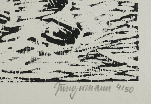 1981. Holzschnitt, in Schwarz, auf rauem hellchamois Bütten. – Originale Künstlergrafik, von Ulrich Jungermann. – Auflage Exemplar Nr. 4/50. – 34,0 x 42,0 cm (Darstellung / Druckstock), 39 x 47 cm (Blatt).