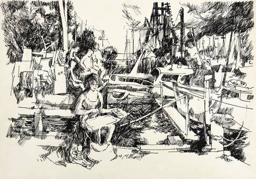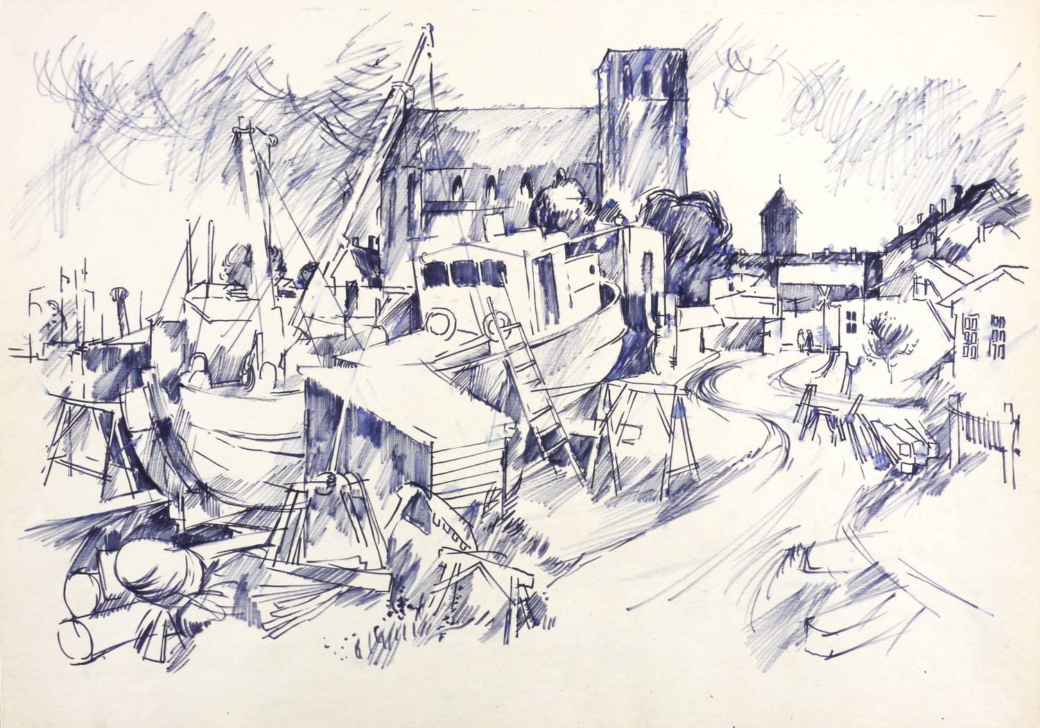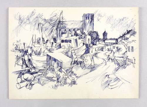 Nicht handsigniert. Verso in Bleistift ausführlich bezeichnet: ″An der Petrikirche II / Filzstift-Federzeichnung / 1966, 30,0 x 42,0 cm″. Nachlass- Stempel. – Im Papier kaum merkliche unscheinbare Flecken. Guter Zustand.