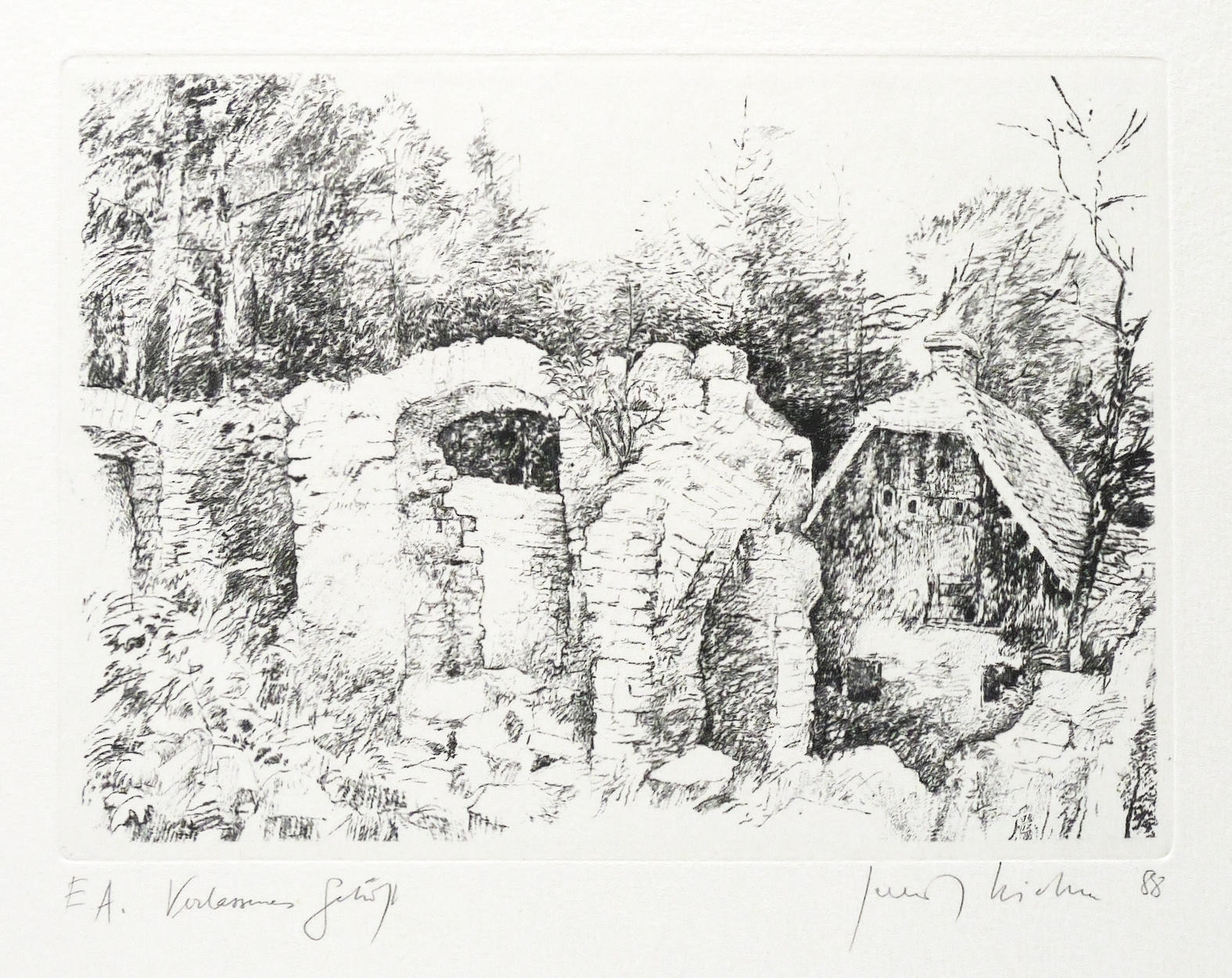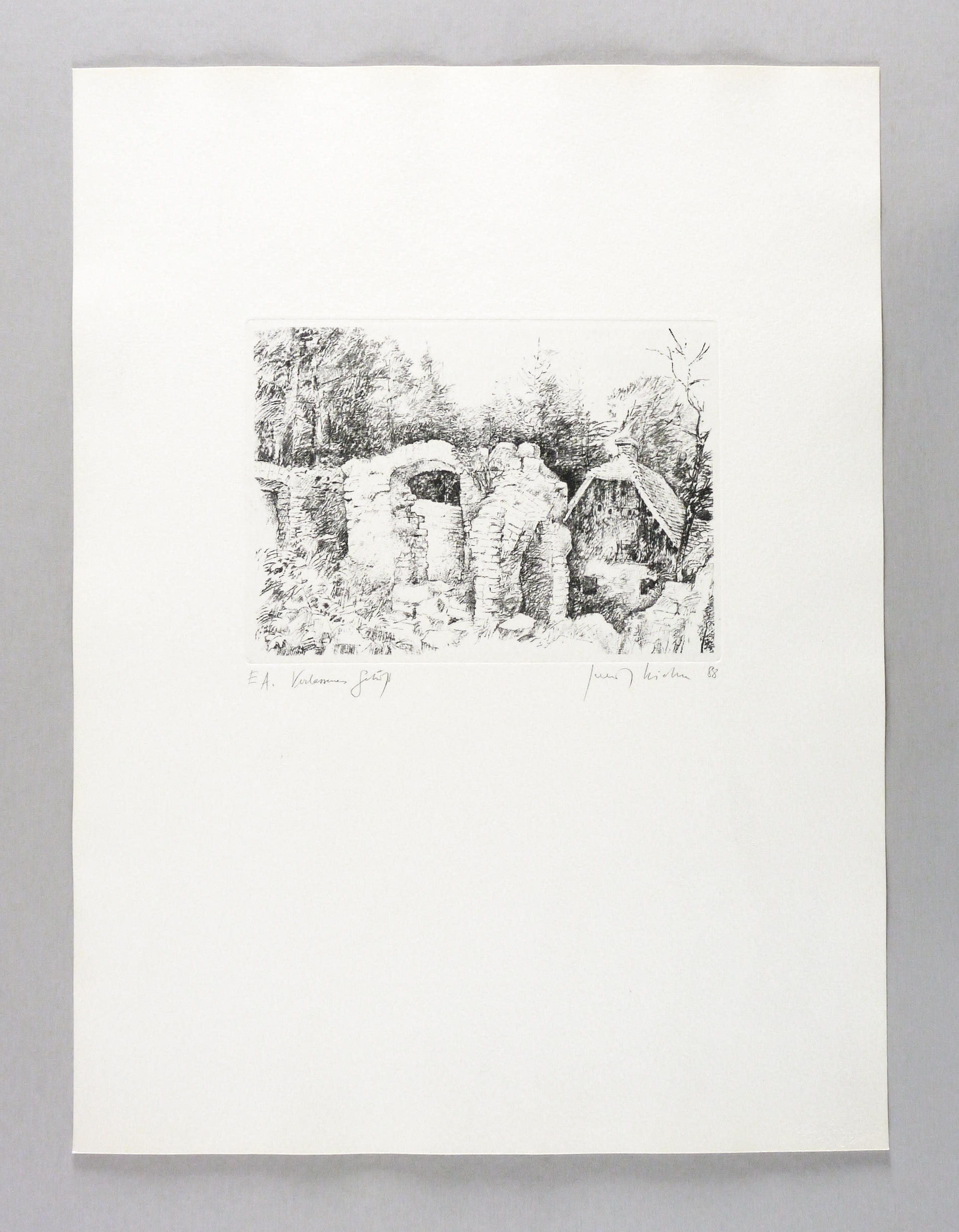 WVZ II-297. – Rechts unten in Bleistift signiert und datiert: ″Gerenot Richter 88″. Links Auflagenbezeichnung und Titel: ″E.A. Verlassenes Gehöft″. Verso bezeichnet. Nachlass-Stempel des Künstlers. – Ohne Mängel. Sehr guter Zustand.