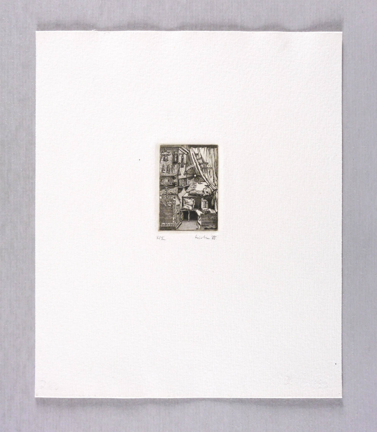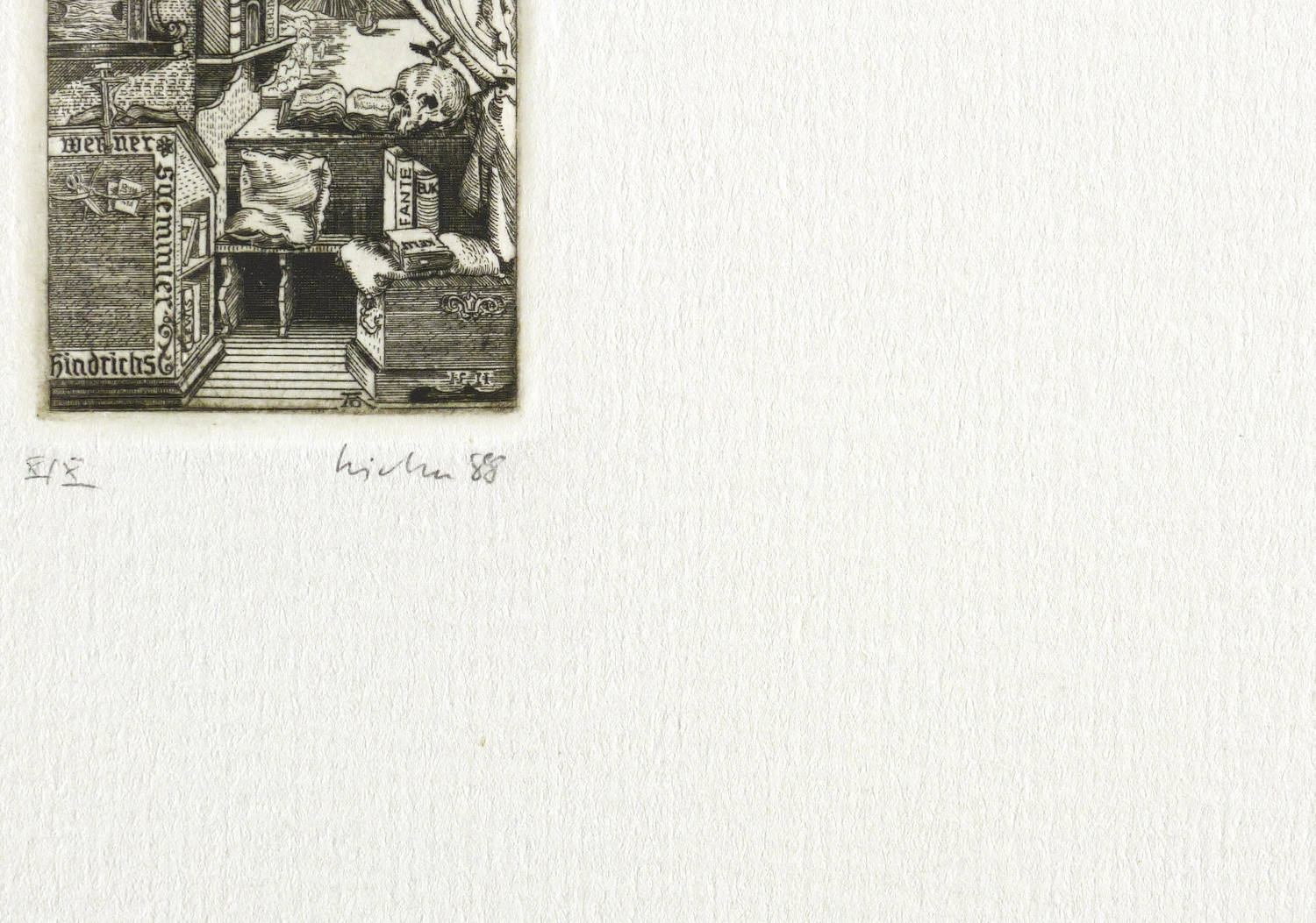 1988. Radierung / Strichätzung, in Schwarz, auf hartem hellchamois Velin. – Exlibris, von Gerenot Richter. – Auflage Exemplar Nr. X/X. – 5,0 x 4,0 cm (Darstellung / Platte), 21 x 18 cm (Blatt).