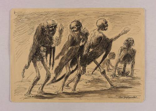1945-1955. Zeichnung / Federzeichnung, in schwarzer Tusche, auf orange-ocker getöntem Velinkarton. – Originale Künstlergrafik, von Curt Großpietsch. – Unikat. – 21,4 x 30,1 cm (Darstellung / Blatt).