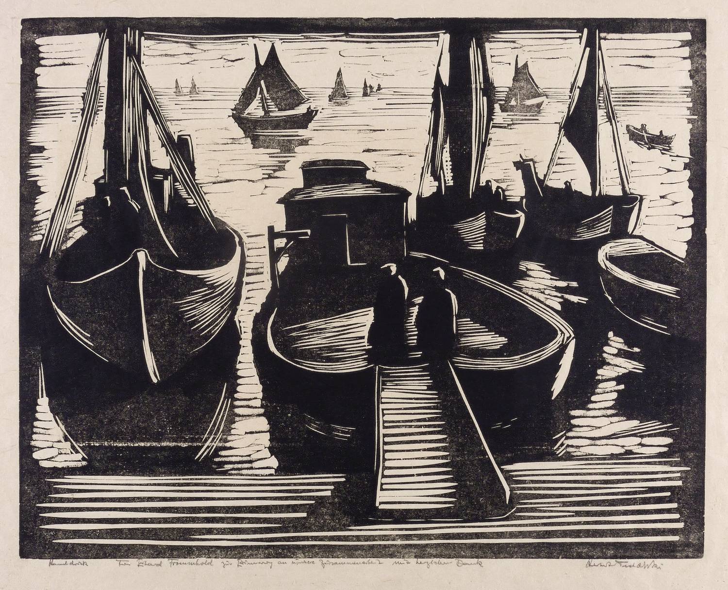 1933/1934. Holzschnitt, in Schwarz, auf rauem hellgelbem Japanbütten. – Originale Künstlergrafik, von Herbert Tucholski. – 39,2 x 49,7 cm (Darstellung / Druckbild), 47 x 60 cm (Blatt).