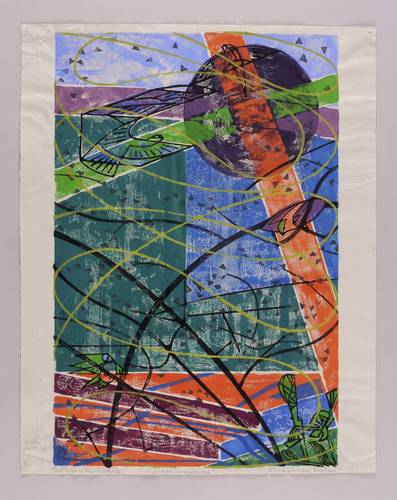 1945-1950. Mischtechnik / Farbholzschnitt & Pochoir, in 10 Farben, auf hellgrau getöntem Bütten. – Von Erna Lincke. – Probedruck. – 58,3 x 38,2 cm (Darstellung / Druckstock), 60 x 48 cm (Blatt).