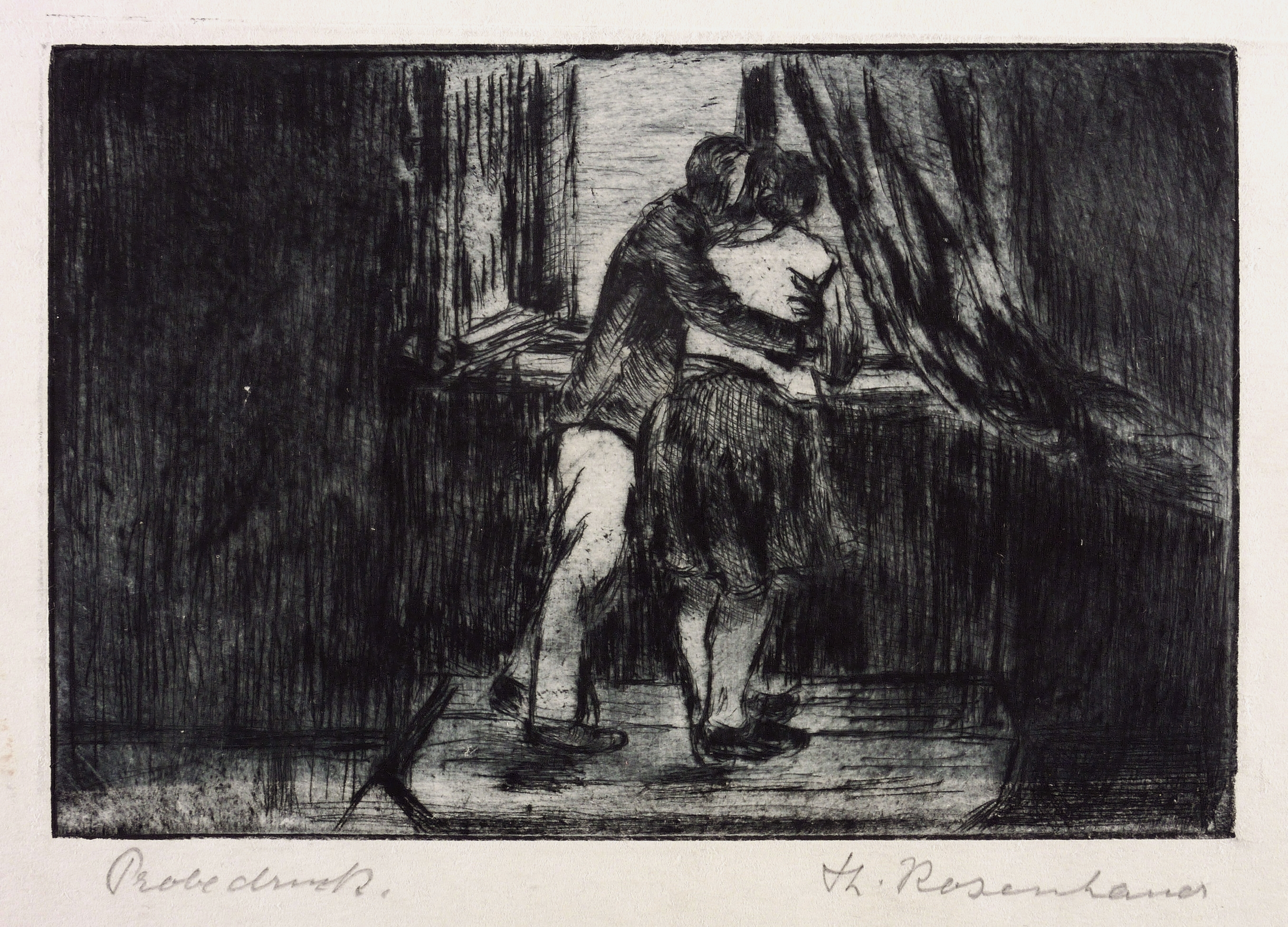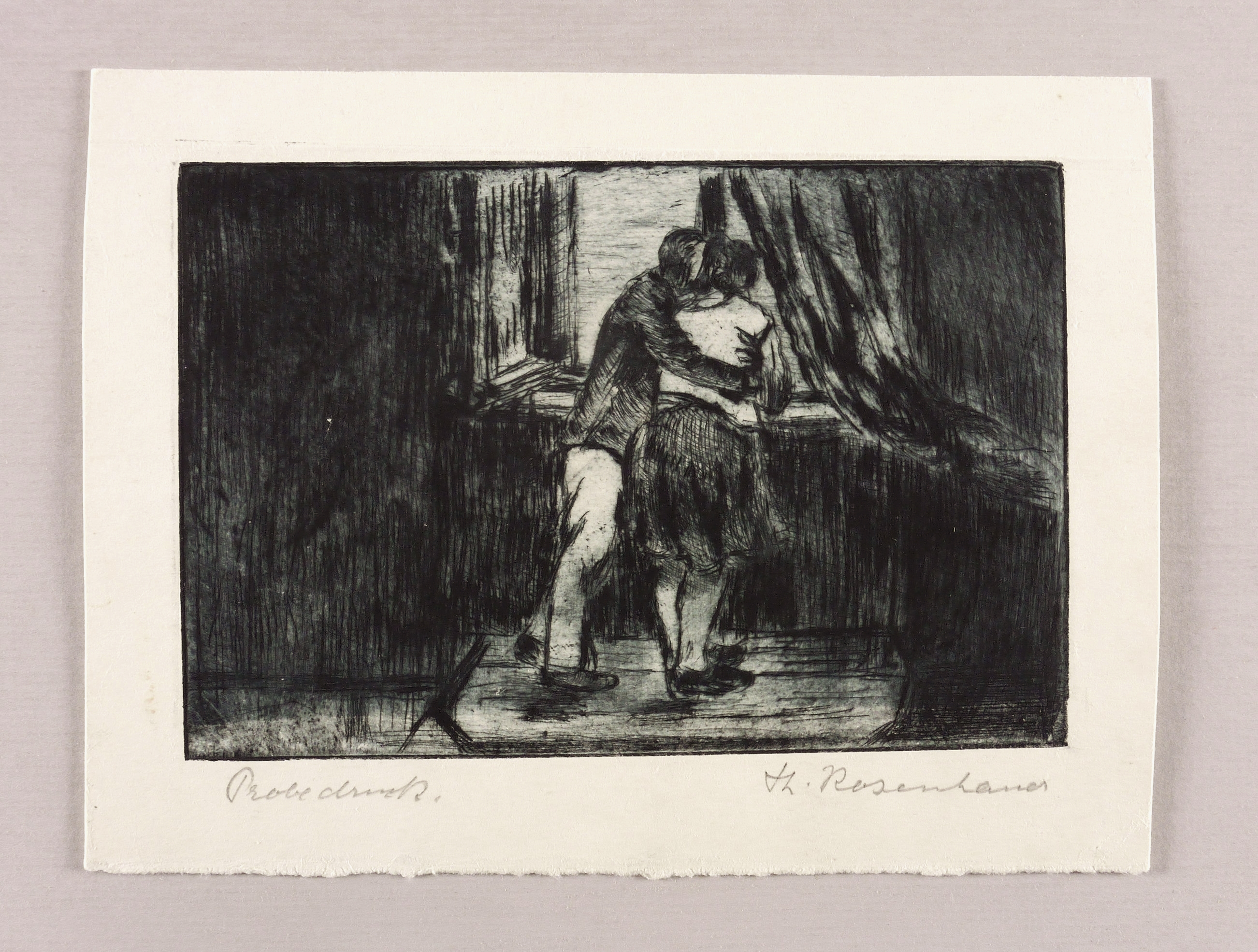 Rechts unten in Bleistift signiert: ″Th Rosenhauer″. Links Auflagenbezeichnung: ″Probedruck.″ – Sehr seltener Probe- und Zustandsdruck mit einigen Abweichungen von den bekannten Auflagendrucken. Ohne den Stuhl in der Raumecke links, vor den hell polierten Flächen in der Gardine rechts. – Schöner gratiger Abzug von der frischen Platte. – Provenienz: Sammlung Erhard Frommhold, Dresden. – Tadellos erhalten. Sehr guter Zustand.