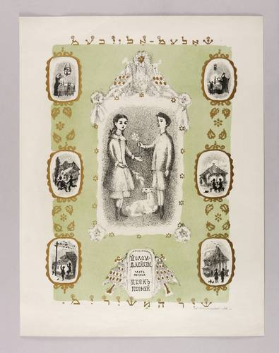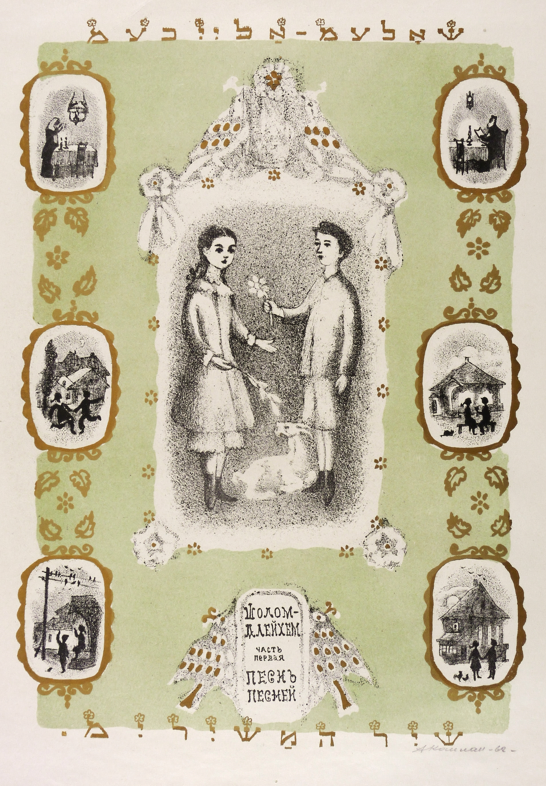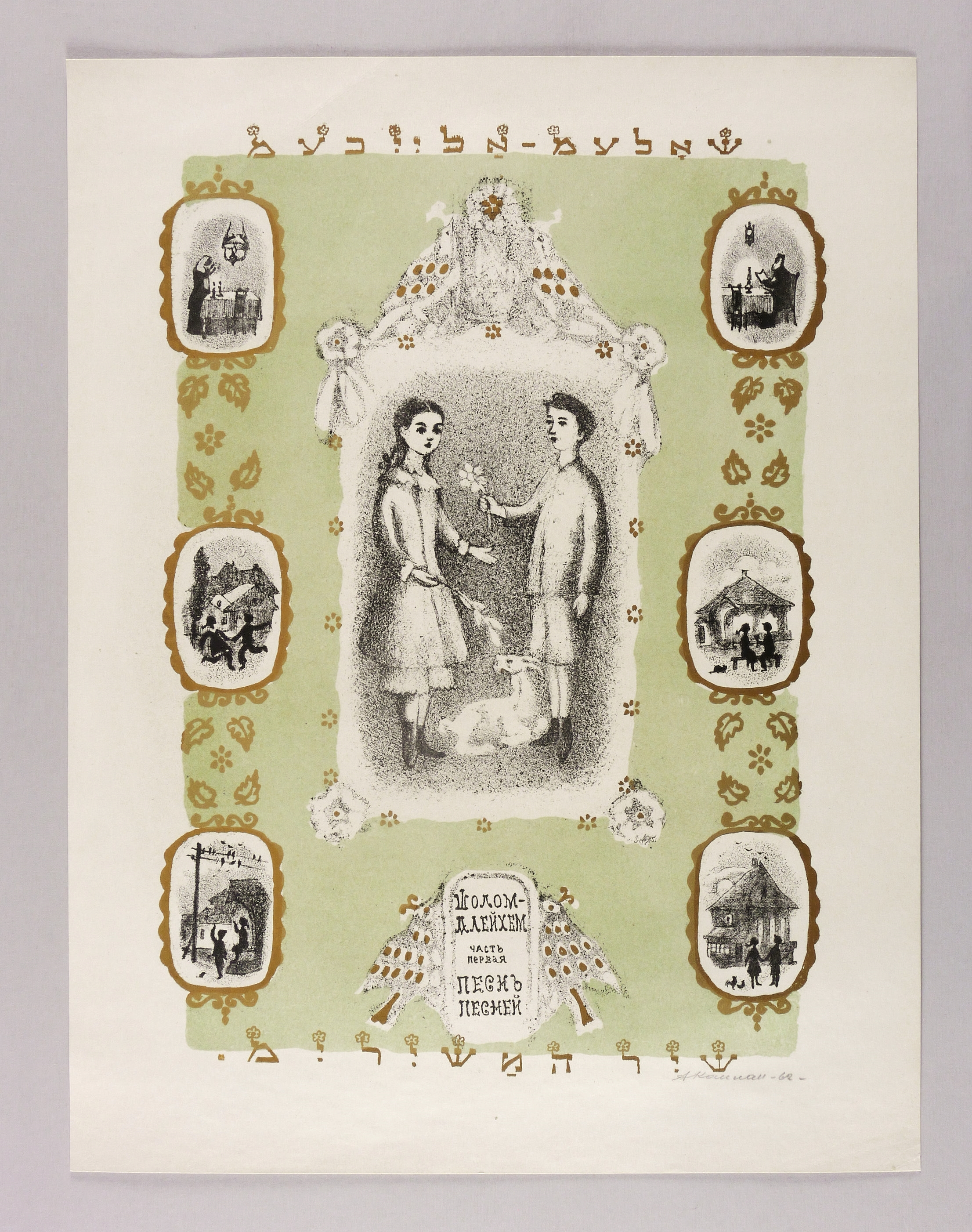 Mayer-Strodt VIII 5. – Rechts unten in Bleistift signiert und datiert: ″АКаплан 62″. Im Stein im unteren Medaillon Inschrift: ″ШОЛОМ АЛЕЙХЕМ // первая часть // ПЕСНЬ ПЕСНЕЙ″. Ober- und unterhalb weitere jiddische Inschrift. – Blatt Nr. 5 aus der siebenteiligen Folge ″Schir- ha-Schirim″ (″Lied der Lieder″) von Alejchem, die Kaplan für die Grosvenor Gallery in London herstellte. – Provenienz: Sammlung Erhard Frommhold, Dresden. Frommhold war Cheflektor und Verlagsleiter des Verlag der Kunst Dresden, der viel mit dem Künstler zusammenarbeitete. – Papier altersbedingt kaum merklich gedunkelt. Blattrand geringfügig bestoßen. Insgesamt guter Zustand.