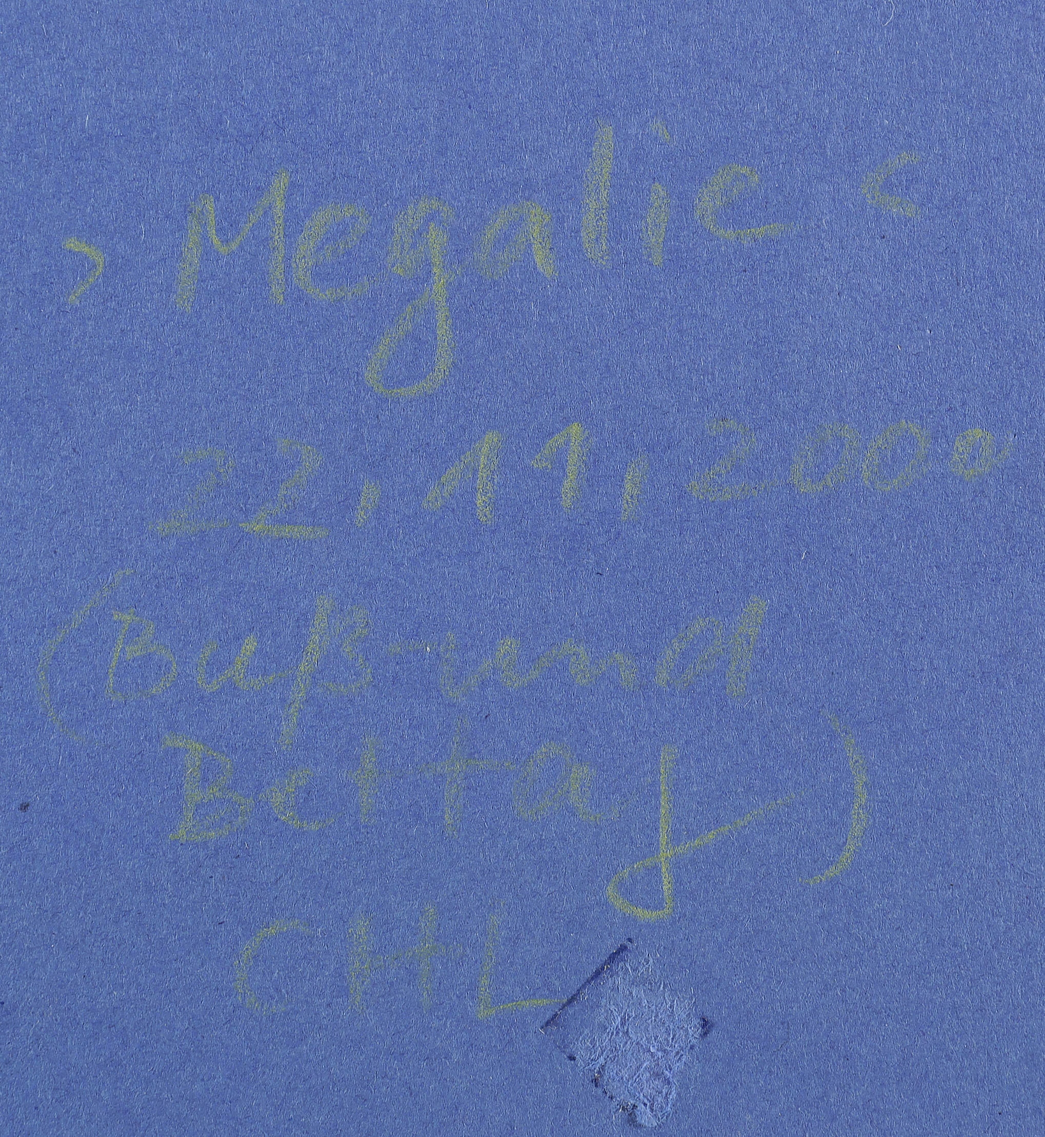 2000. Collage / Papiercollage & Fettkreide, auf blauem Papier. – Originale Künstlergrafik, von Christiane Latendorf. – Unikat. – 13,8 x 10,4 cm (Darstellung / Blatt).