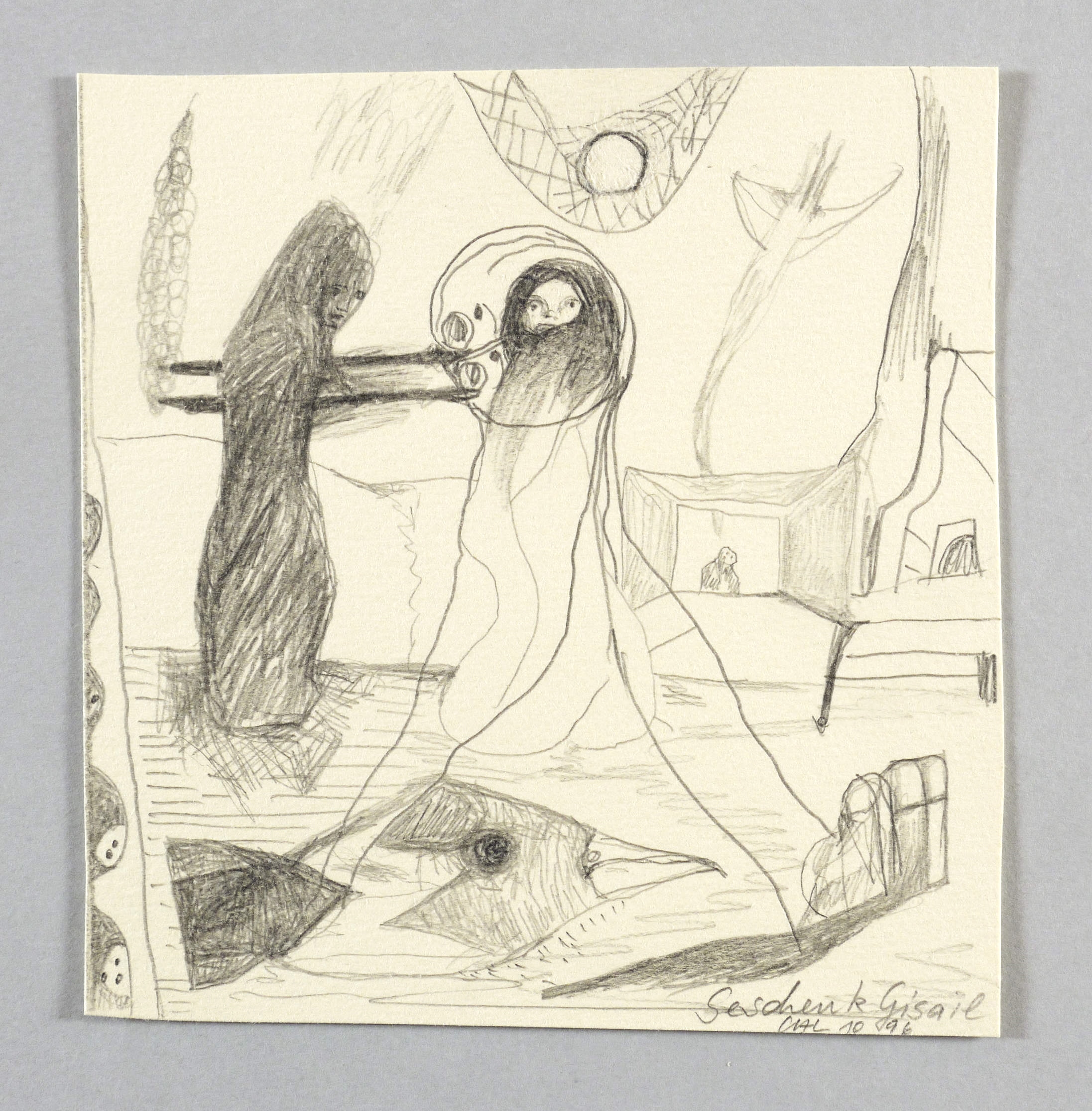 1996. Zeichnung / Bleistiftzeichnung, auf hellgelbem Karton. – Originale Künstlergrafik, von Christiane Latendorf. – Unikat. – 12,3 x 11,6 cm (Darstellung / Blatt).