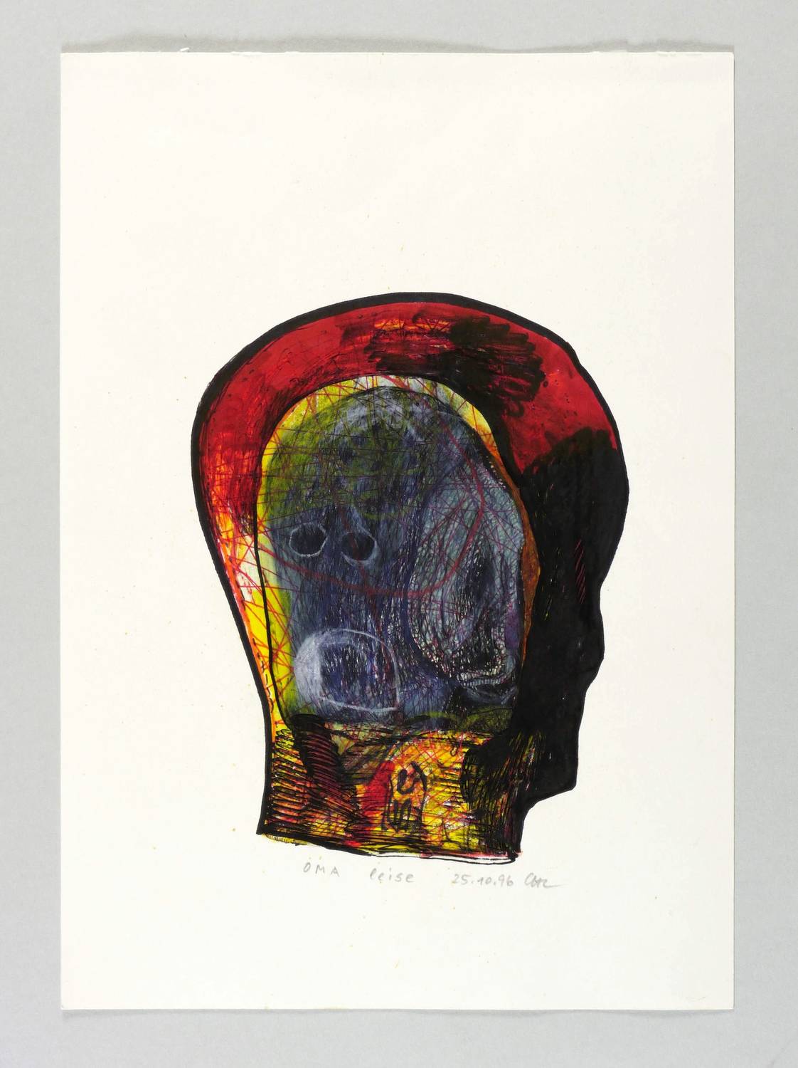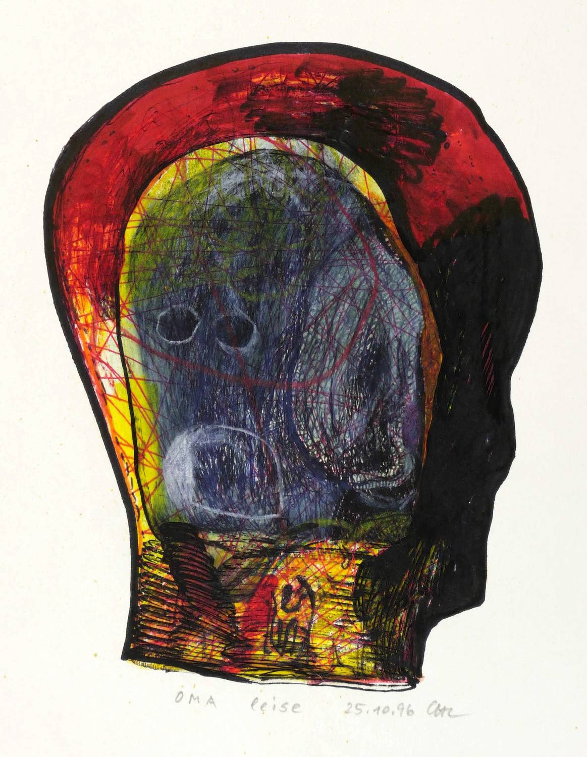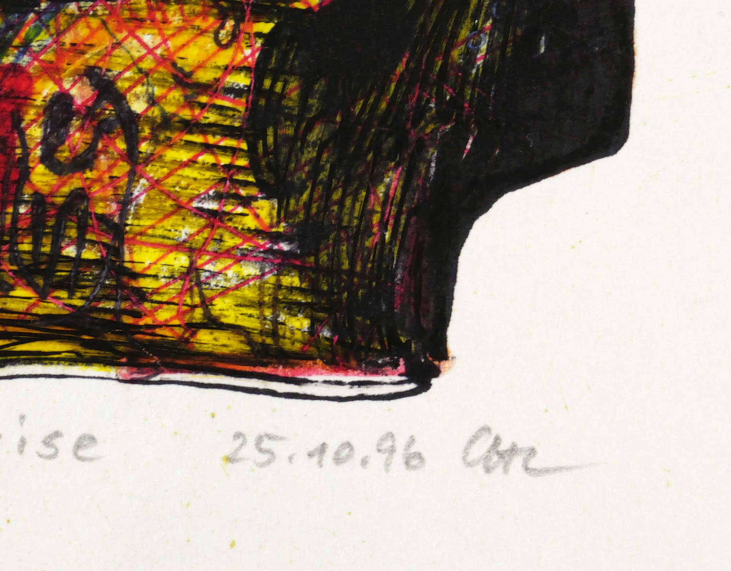 1996. Mischtechnik / Farbstifte, Fettkreide, Tusche & Kugelschreiber, auf Papier. – Originale Künstlergrafik, von Christiane Latendorf. – Unikat. – 18,0 x 14,0 cm (Darstellung), 29,5 x 21 cm (Blatt).