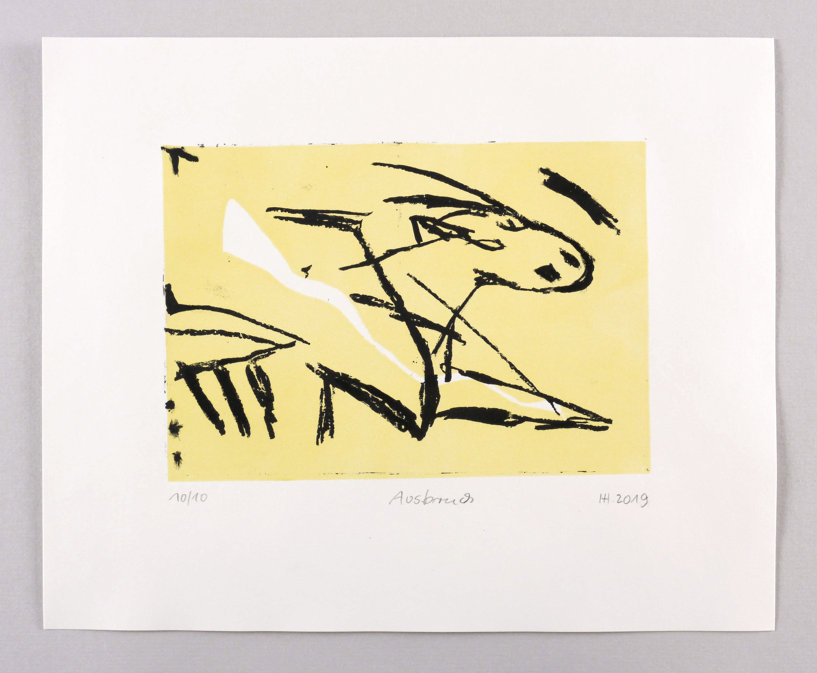 2019. Farblithografie / Pinsellithografie, in Gelb & Schwarz, auf hellgelbem Karton. – Originale Künstlergrafik, von Helene Heyder. – Auflage Exemplar Nr. 10/10. – 13,9 x 20,0 cm (Darstellung / Druckbild), 25 x 30 cm (Blatt).