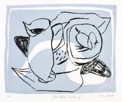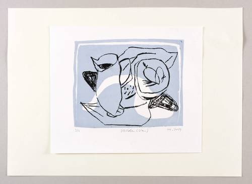 2019. Farblithografie / Pinsellithografie, in Blau & Schwarz, auf weißem Karton. – Originale Künstlergrafik, von Helene Heyder. – Auflage Exemplar Nr. 3/4. – 15,7 x 19,3 cm (Darstellung / Druckbild), 23 x 27 cm (Blatt), 30 x 41 cm (Trägerblatt).