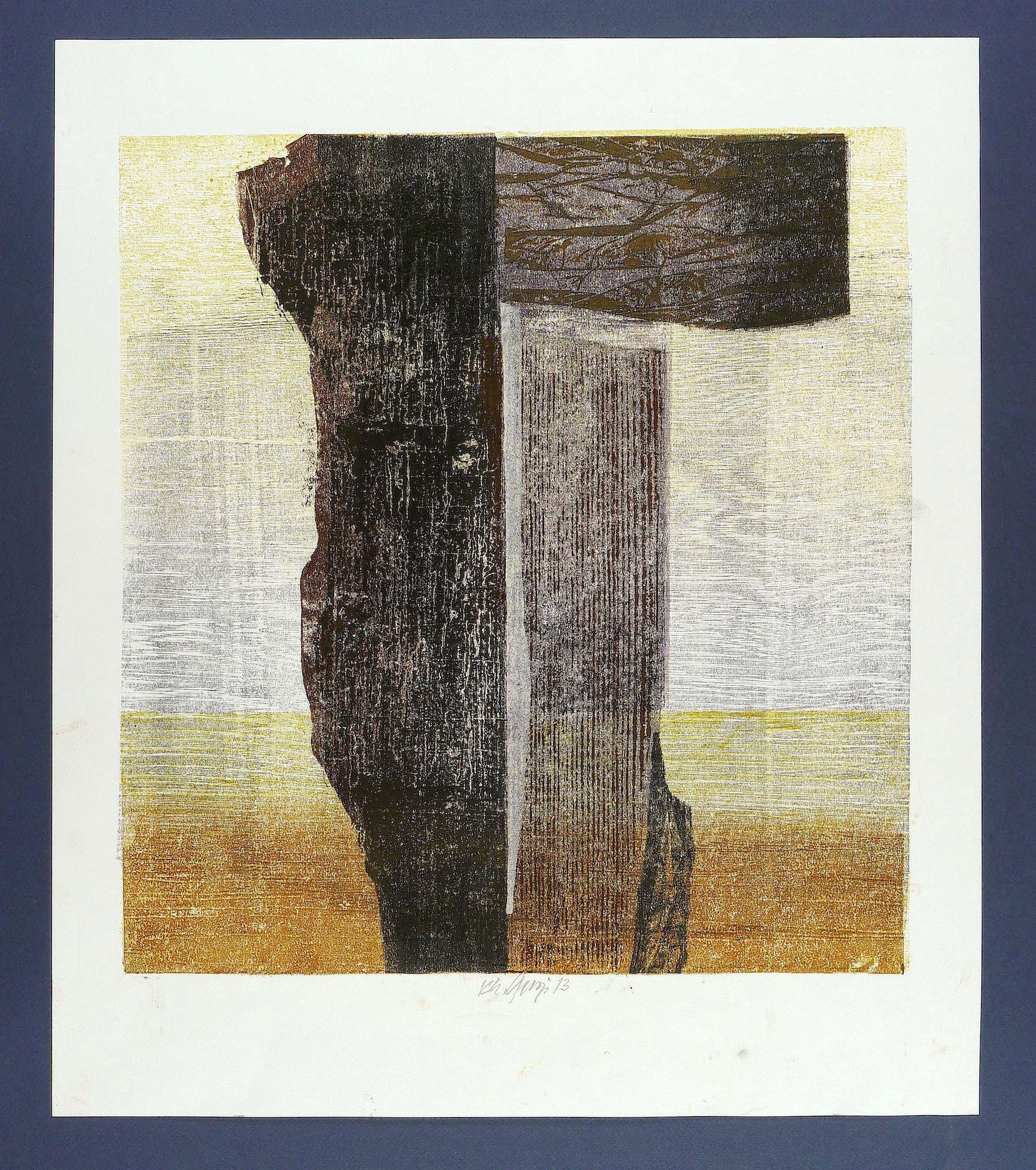 2013. Farbholzschnitt & Materialdruck, auf weißem Karton. – Originale Künstlergrafik, von Karlheinz Georgi. – Unikat. – 44,5 x 41,0 cm (Darstellung / Druckstock), 57 x 49 cm (Blatt).